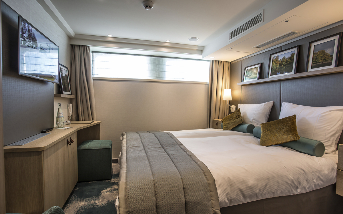 Alle Kabinen liegen außen und sind komfortabel und luxuriös eingerichtet mit kleinen Fenstern, die aus Sicherheitsgründen nicht zu öffnen sind.Die Betten lassen sich wahlweise als Doppel- oder Einzelbetten stellen Die Kabinen dieser Kategorie liegen im hinteren Bereich des Schiffes, bei fahrendem Schiff verstärkte Maschinengeräusche.
