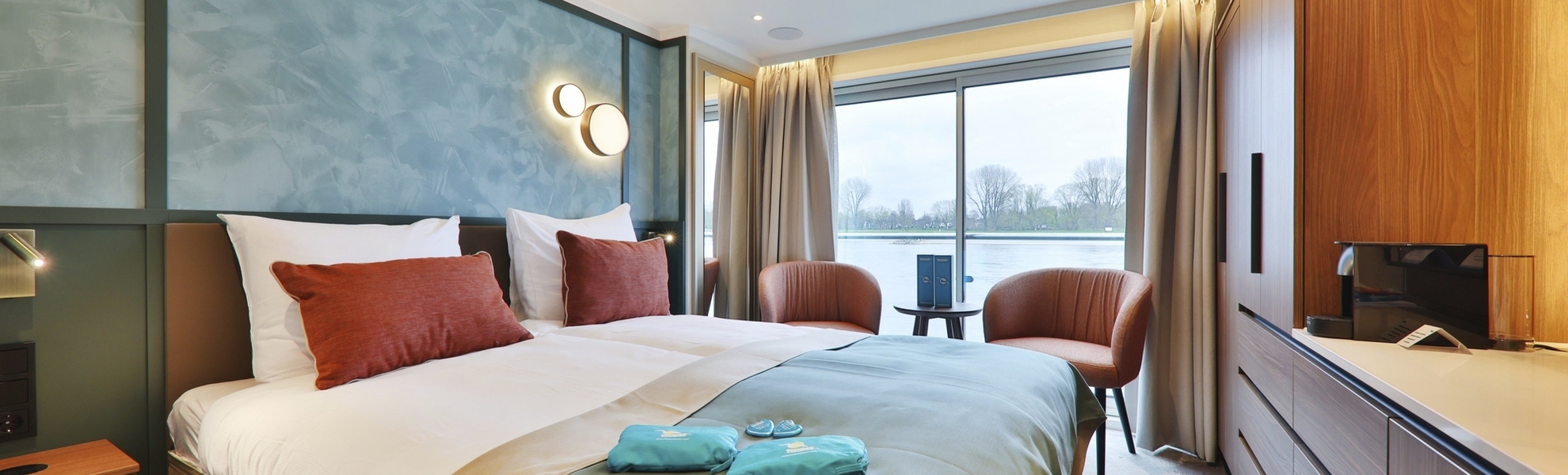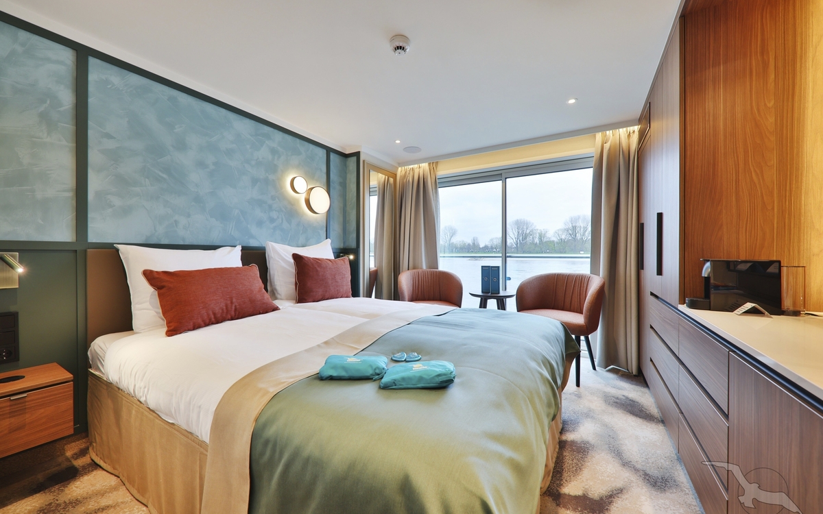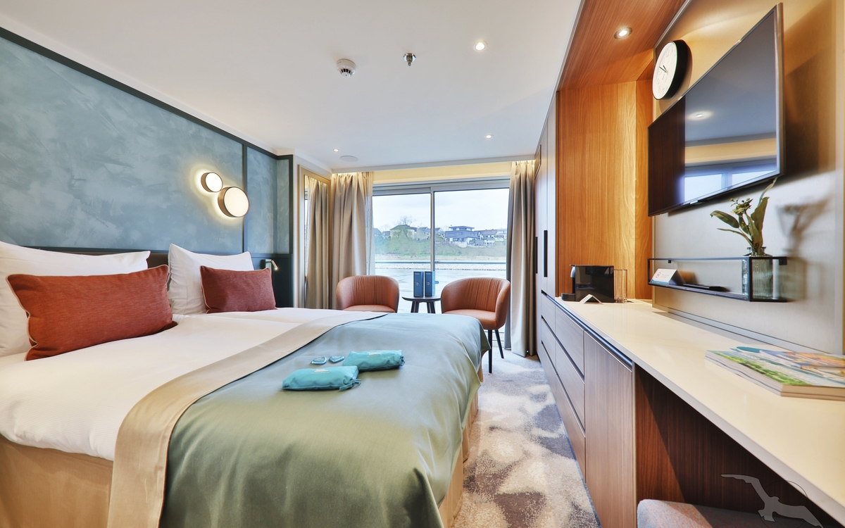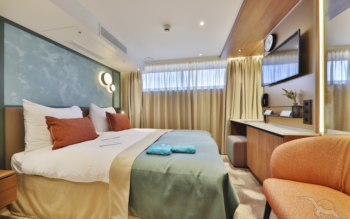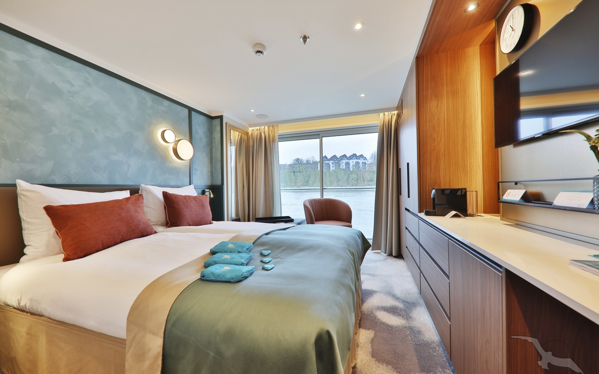 Alle Kabinen liegen außen, sind komfortabel sowie luxuriös eingerichtet und haben einen französischen Balkon. Die Betten lassen sich wahlweise als Doppel- oder Einzelbetten stellen.
