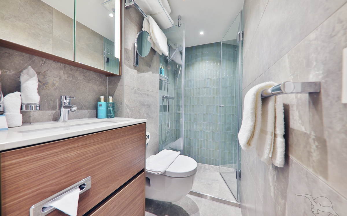 Ausstattung: Dusche/WC, Fön, individuell regulierbare Klimaanlage, SAT-TV (Flachbildschirm), Radio, Minibar, Kaffeemaschine, Safe, Telefon, Bordspannung 230 V Wechselstrom. Kabinengröße ca. 12,5 qm.