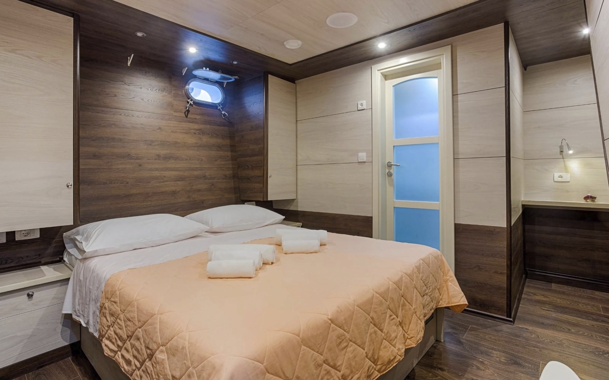 Sie bietet Platz für 36 Gäste in 18 komfortabel ausgestatteten Kabinen. An Bord können Sie ein großzügiges Sonnendeck mit Whirlpool, bequemen Liegestühlen und Fitnessausstattung wie SUP-Boards und Schnorchelmasken genießen – perfekt, um das kristallklare Wasser der Adria zu erleben.