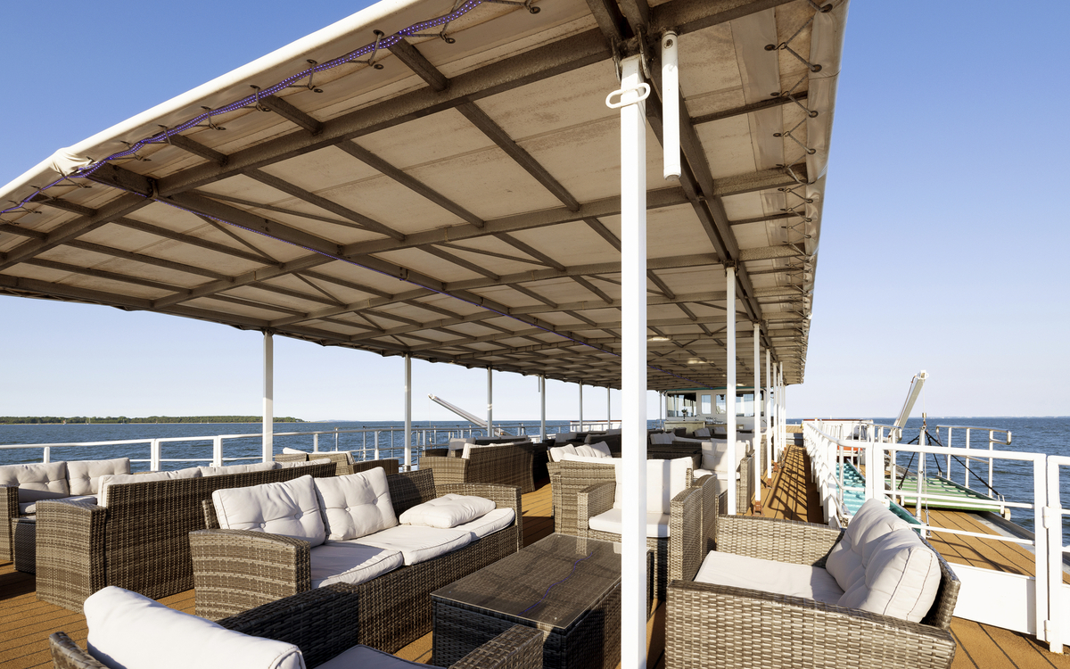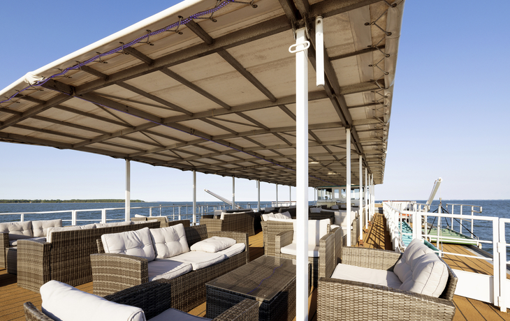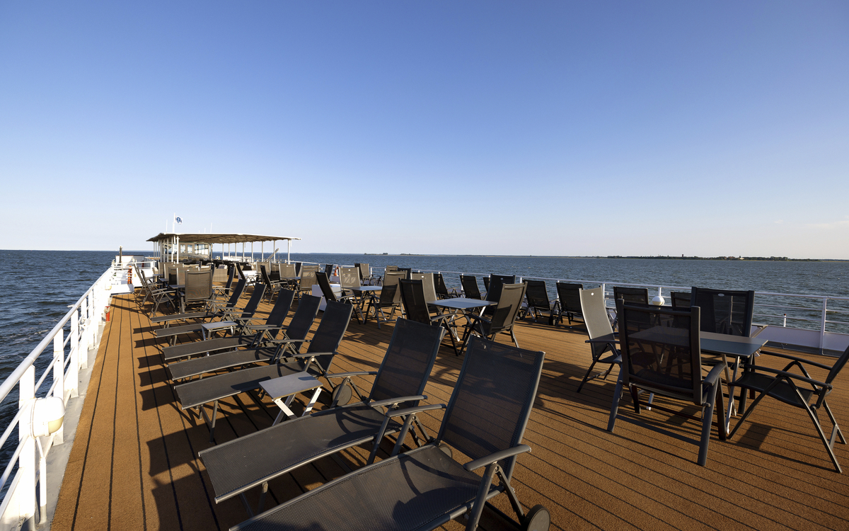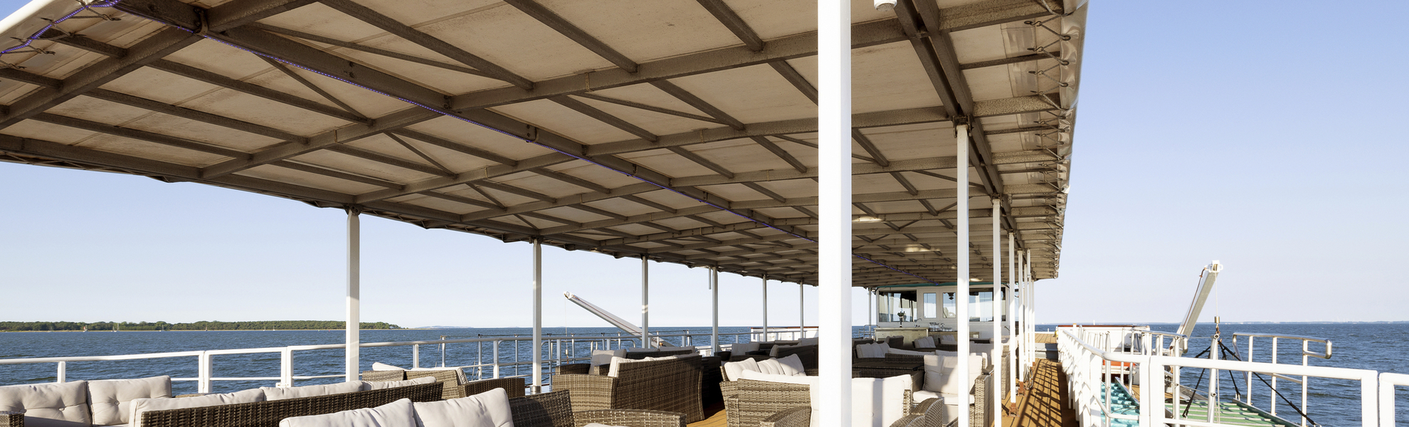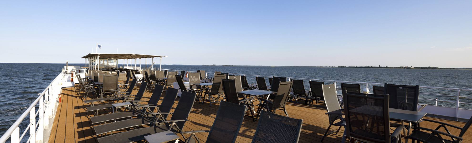 Vom großen Sonnendeck können Sie die idyllische Landschaft beobachten. Unser Schiff für besondere Routen an der Ostseeküste.