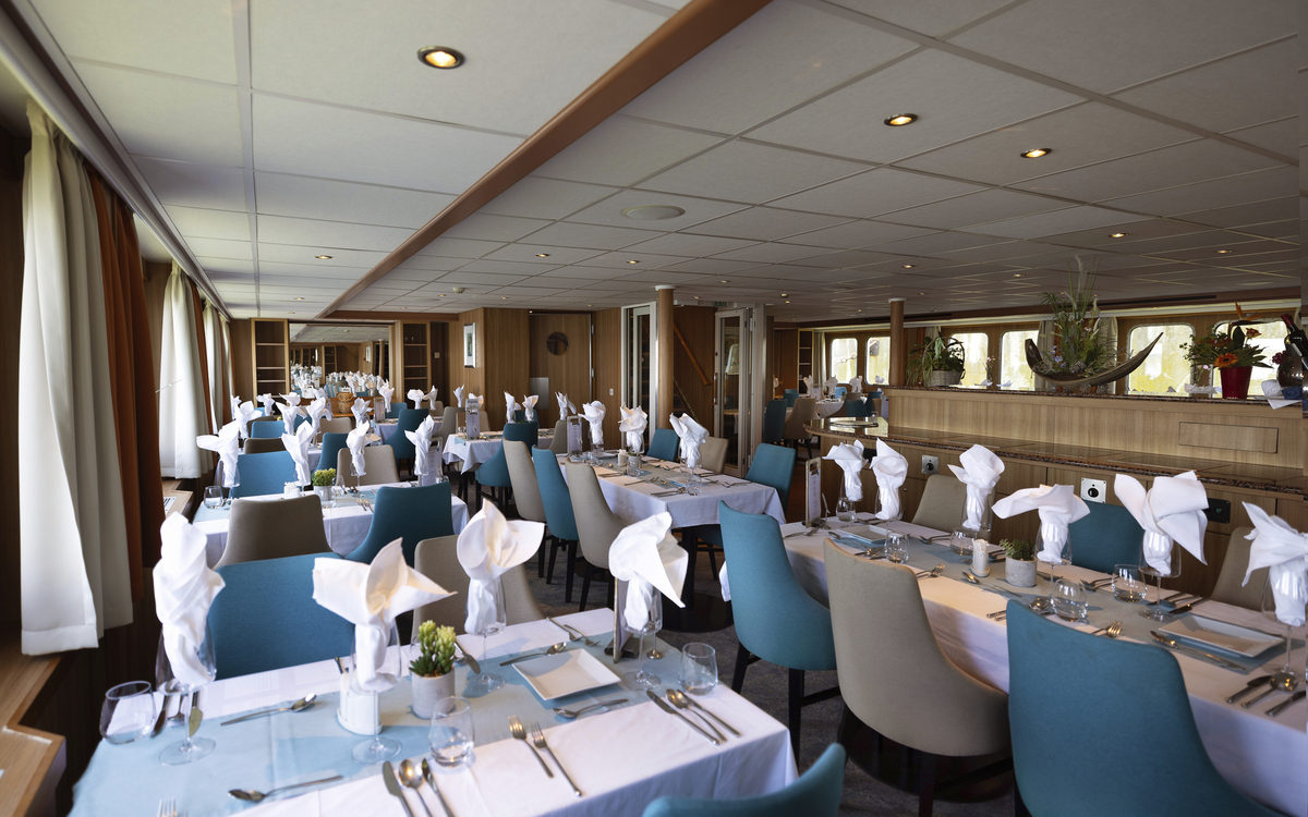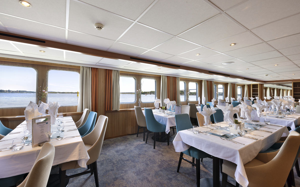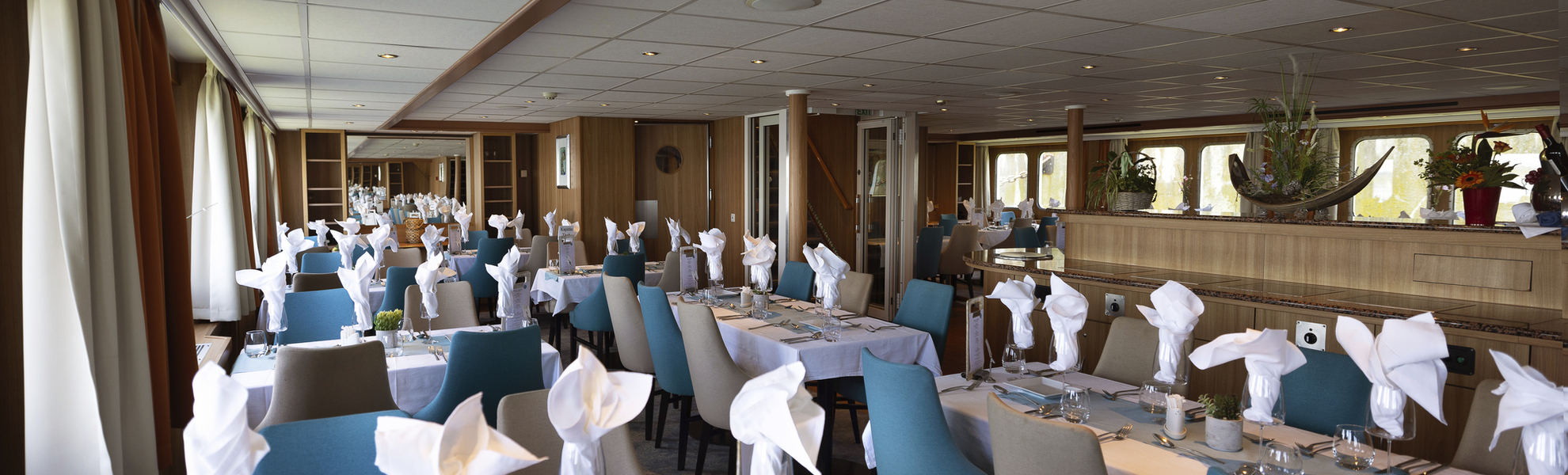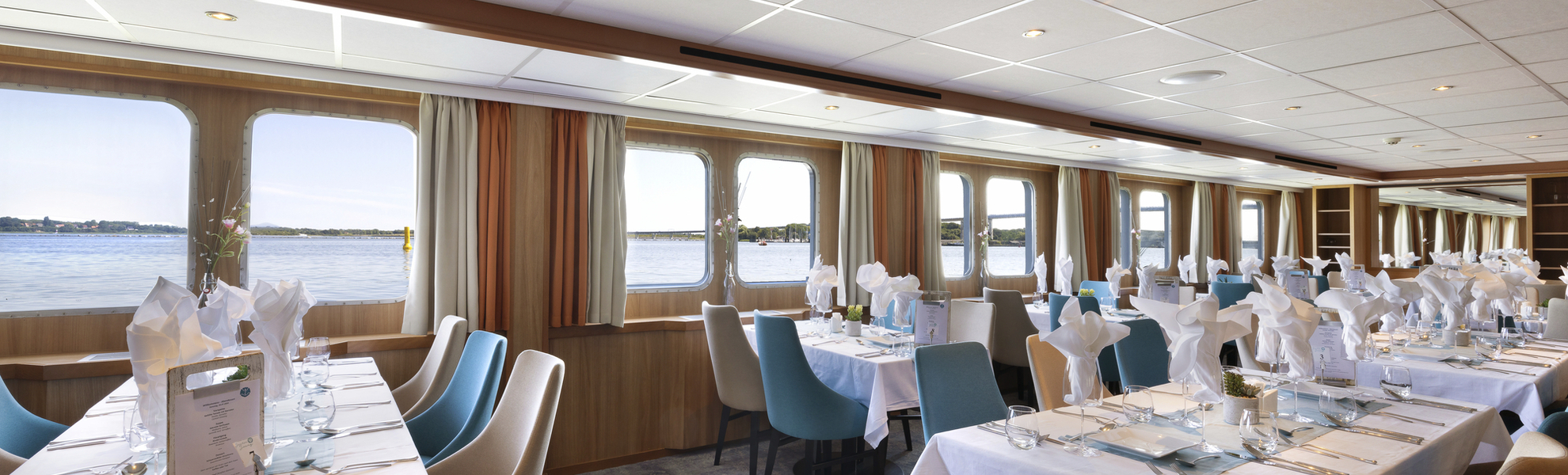 MS Junker Jörg verfügt über ein komfortables und zugleich gemütliches Restaurant. Ein aufmerksames Restaurant- und Küchenteam kümmert sich à la carte um Ihr kulinarisches Wohlergehen.