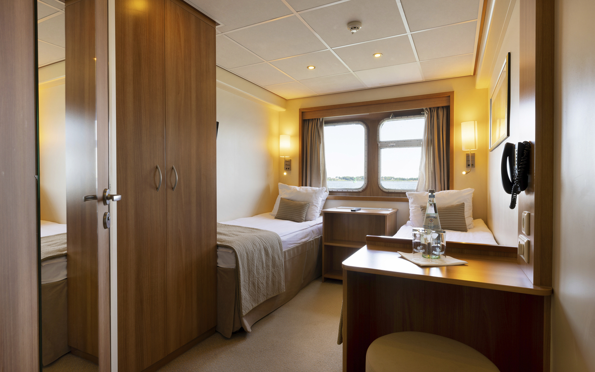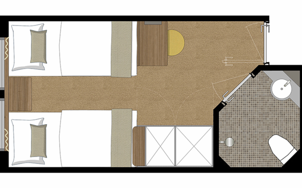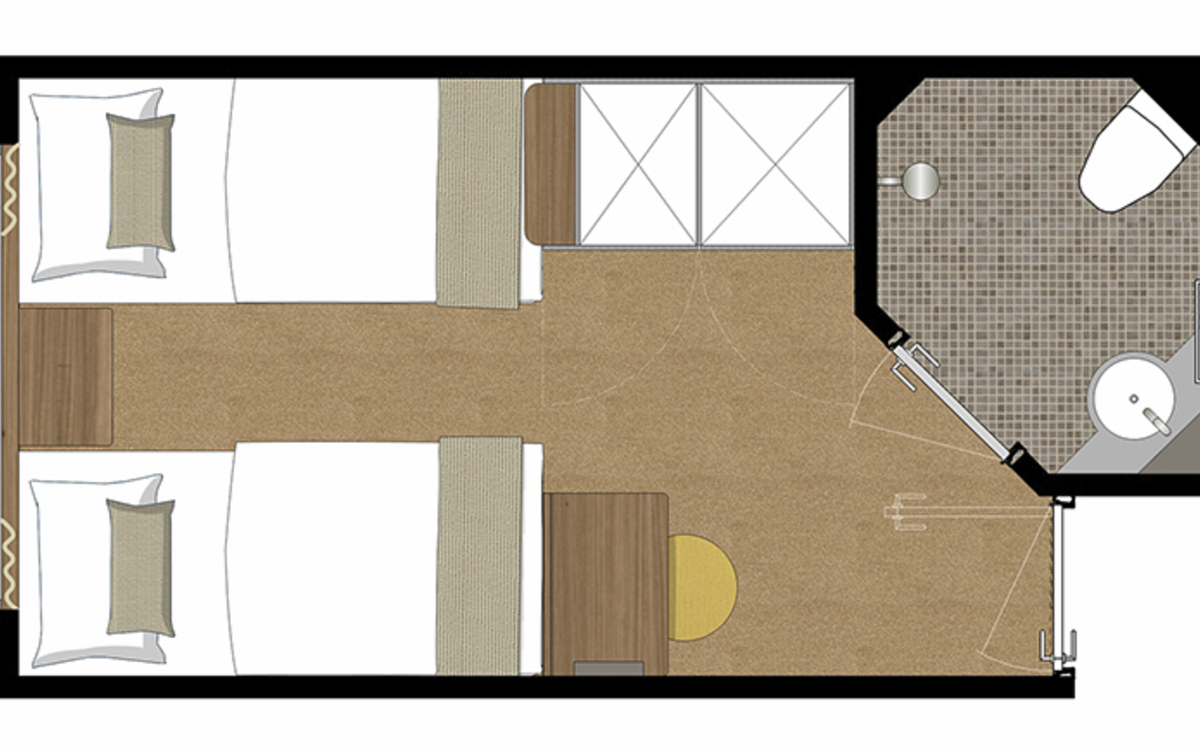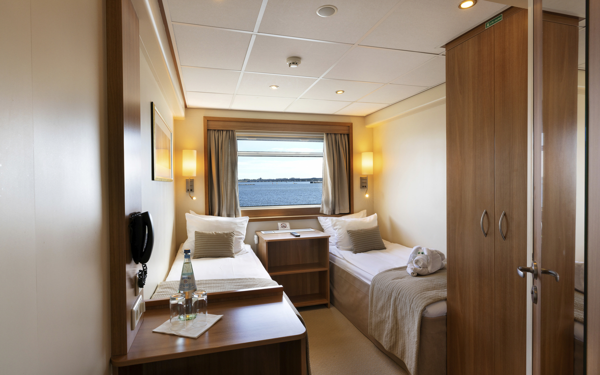 Ausstattung: Dusche/WC/Föhn, Klimaanlage, TV/Bordradio, Safe, Telefon, Bordspannung 230V Wechselstrom. Zwei Einzelbetten (nicht zusammenstellbar), Kabinengröße ca. 11 qm