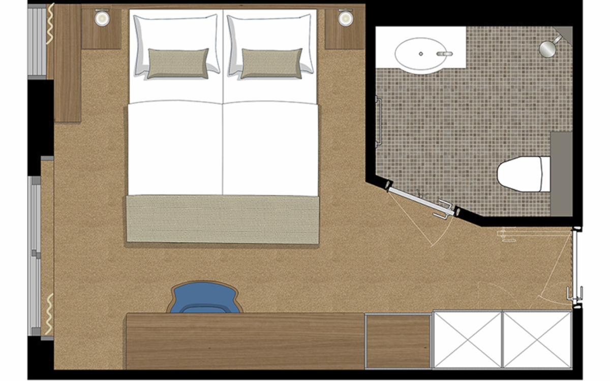 Ausstattung: Dusche/WC, Fön, Klimaanlage, TV/Bordradio, Minibar, Safe,Telefon, kleine Tageszeitung, Bordspannung 230 V Wechselstrom.