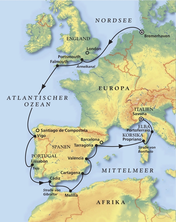 Bremerhaven - Portsmouth - Vigo - Lissabon - Cádiz - Cartagena - Valencia - Tarragona - Portoferraio - Savona