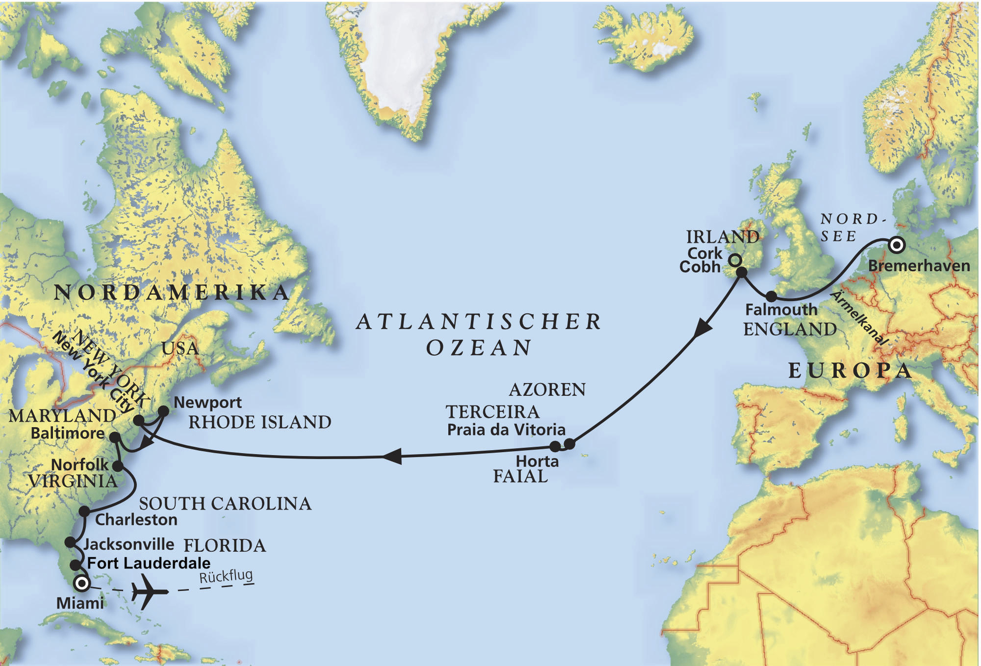 Bremerhaven - Falmouth - Ponta Delgada - Horta - New York City - Newport - Baltimore - Charleston - Jacksonville - Miami