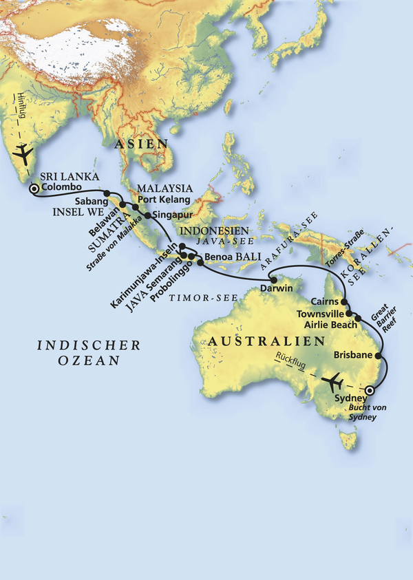 Colombo - Belawan - Port Kelang - Singapur - Semarang - Benoa - Darwin - Cairns - Airlie Beach - Brisbane - Sydney