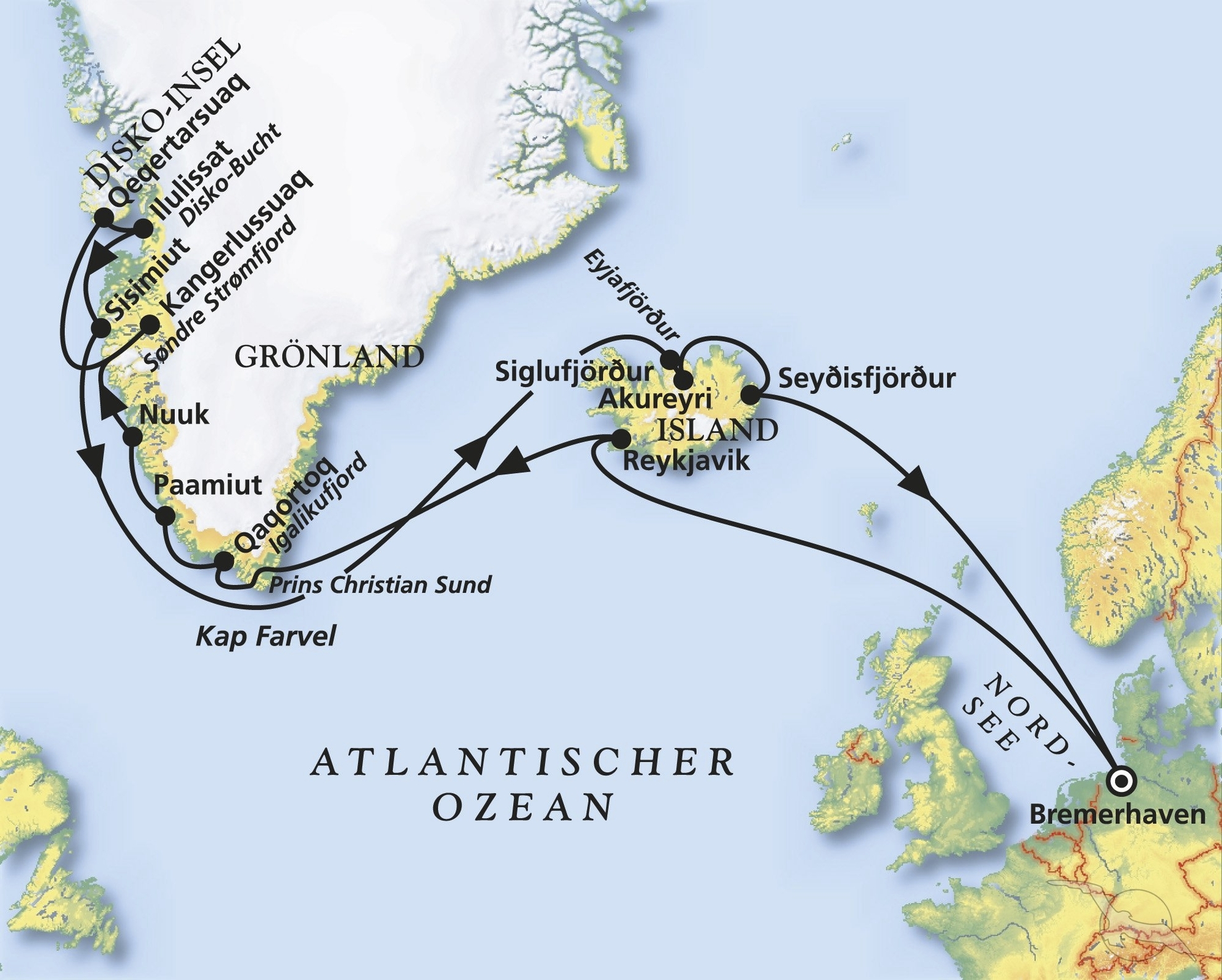 Bremerhaven - Reykjavik - Qaqortoq - Paamiut - Nûk - Ilulissat - Sisimiut - Siglufjörður - Akureyri - Seyðisfjörður - Bremerhaven