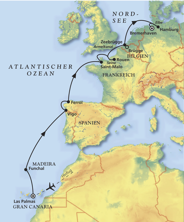 Las Palmas - Funchal - Vigo - Saint-Malo - Rouen - Zeebrügge (Brügge) - Hamburg - Bremerhaven