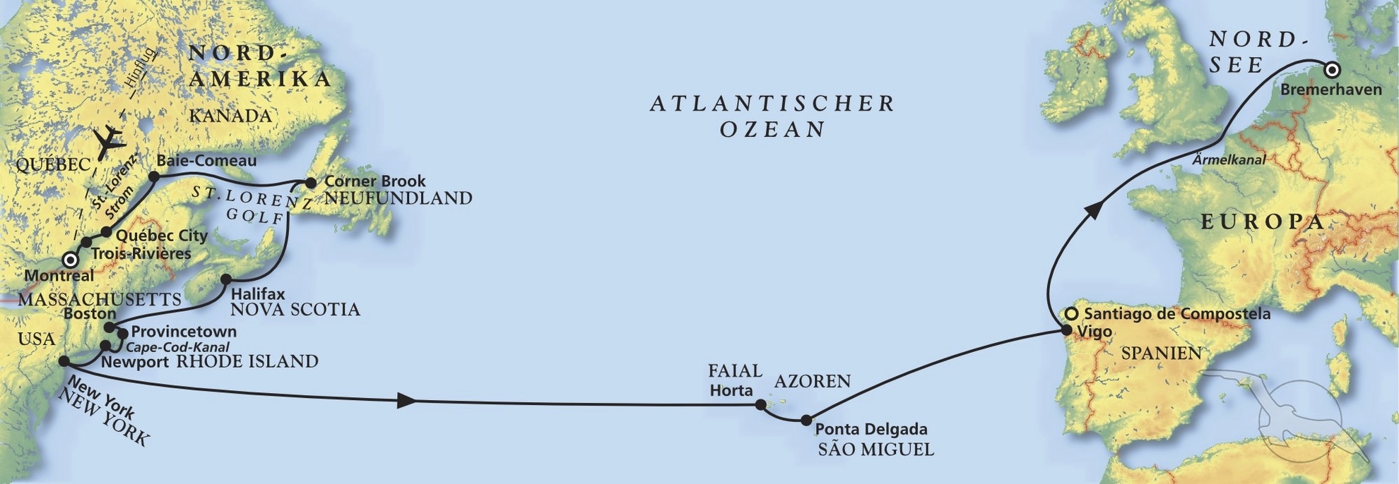 Montreal - Québec - Halifax - Boston - New Port - New York - Horta - Ponta Delgada - Vigo - Bremerhaven
