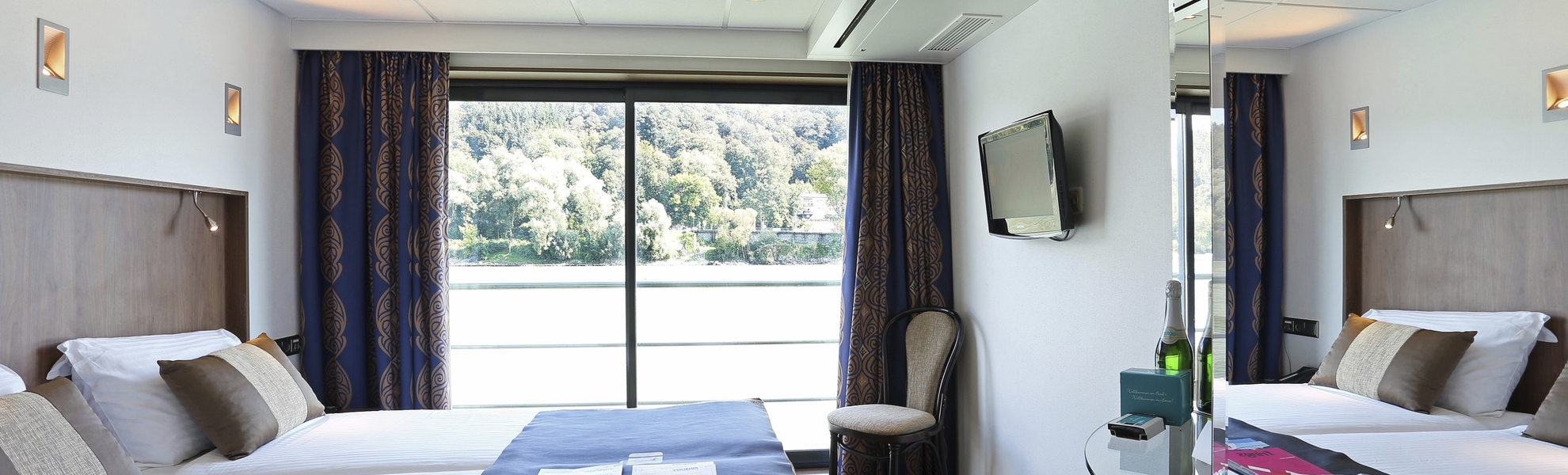 Alle Kabinen liegen außen, sind komfortabel und elegant eingerichtet mit französischem Balkon, raumhoher Fensterfront und Schiebetür. Die Betten lassen sich wahlweise als Doppel- oder Einzelbetten stellen.
