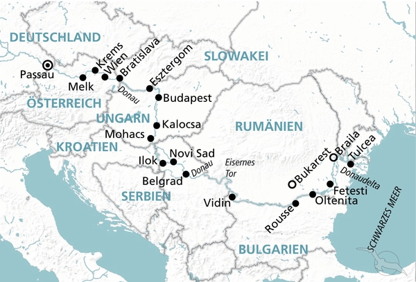 Passau - Wien - Novi Sad - Belgrad - Oltenita - Fetesti - Tulcea - Rousse - "Eisernes Tor" - Belgrad - Mohacs - Kalocsa - Budapest - Bratislava - Krems - Melk - Passau