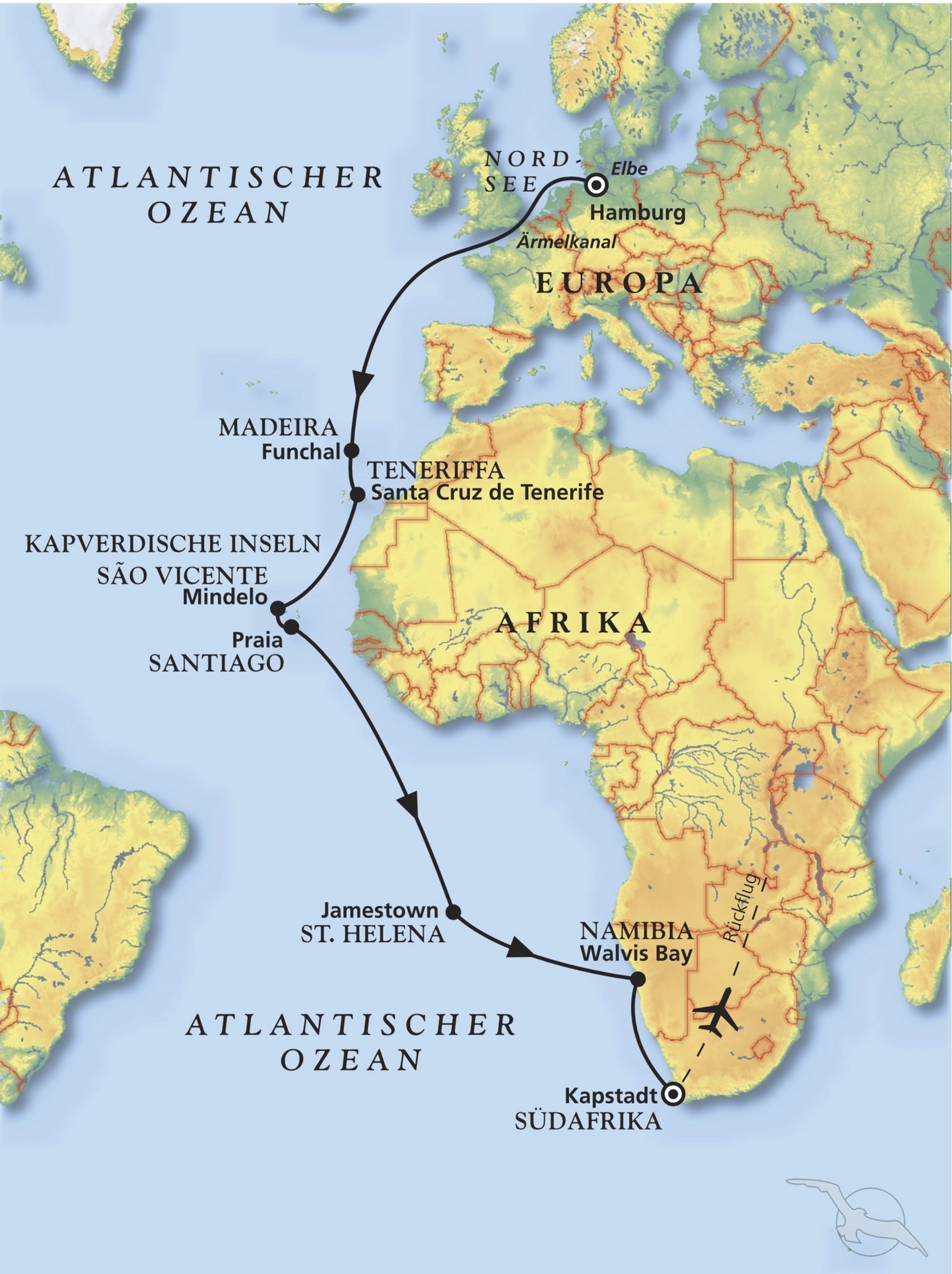 Hamburg - Funchal - Santa Cruz de Tenerife - Mindelo - Praia - Äquatorüberquerung - Walvis Bay - Kapstadt