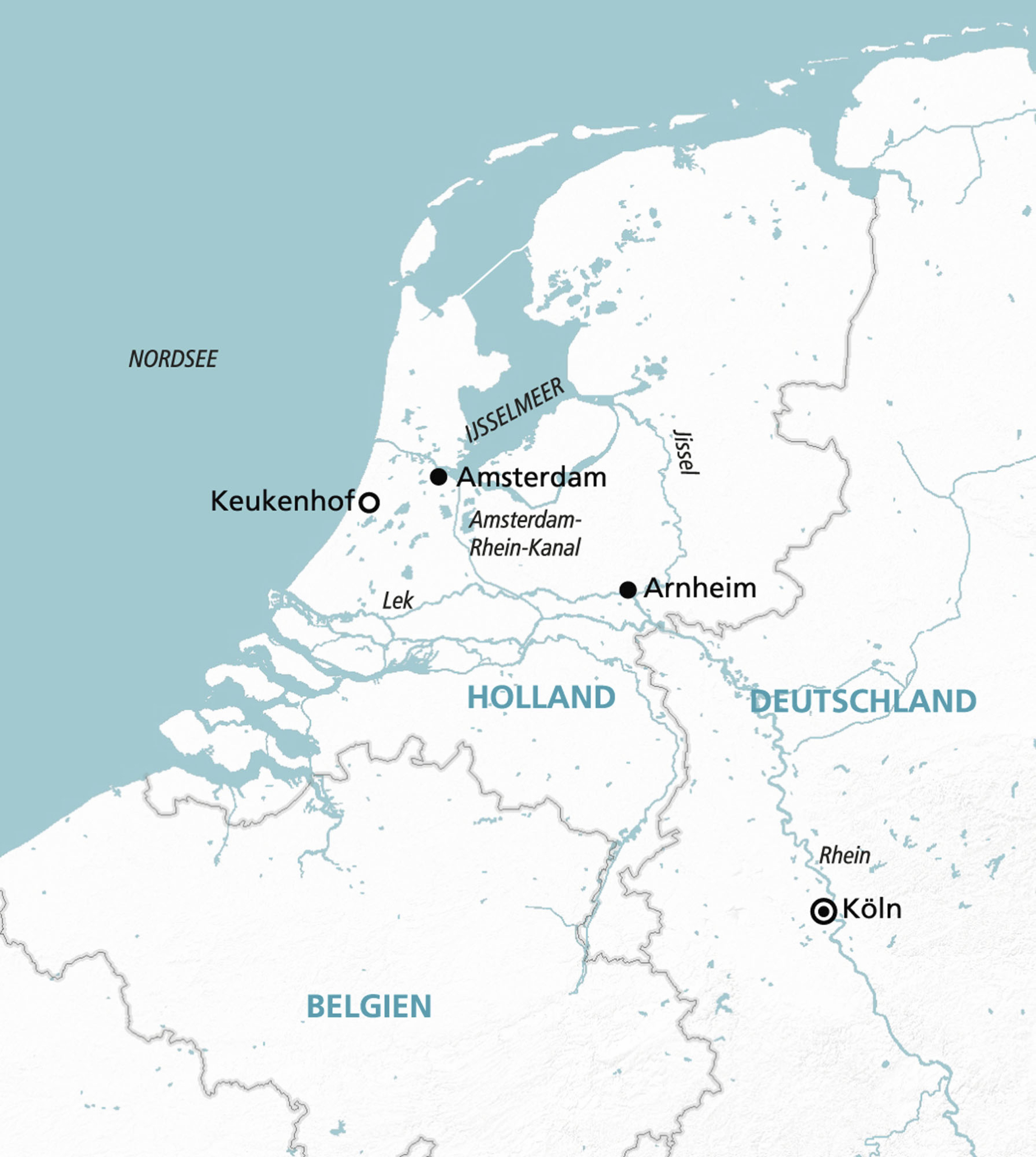 Kosmopolitisch, malerisch und manchmal ein wenig verträumt zeigt sich diese Stadt. Sie erwartet ein buntes Bouquet an Sehenswürdigkeiten. Bummeln Sie über Blumenmärkte und entlang der Grachten und genießen Sie den Blick auf hochherrschaftliche Patrizier- und Giebelhäuser während einer Grachtenfahrt. Stromaufwärts geht es über Arnheim durch das Gebiet des Niederrheins zurück nach Köln.
