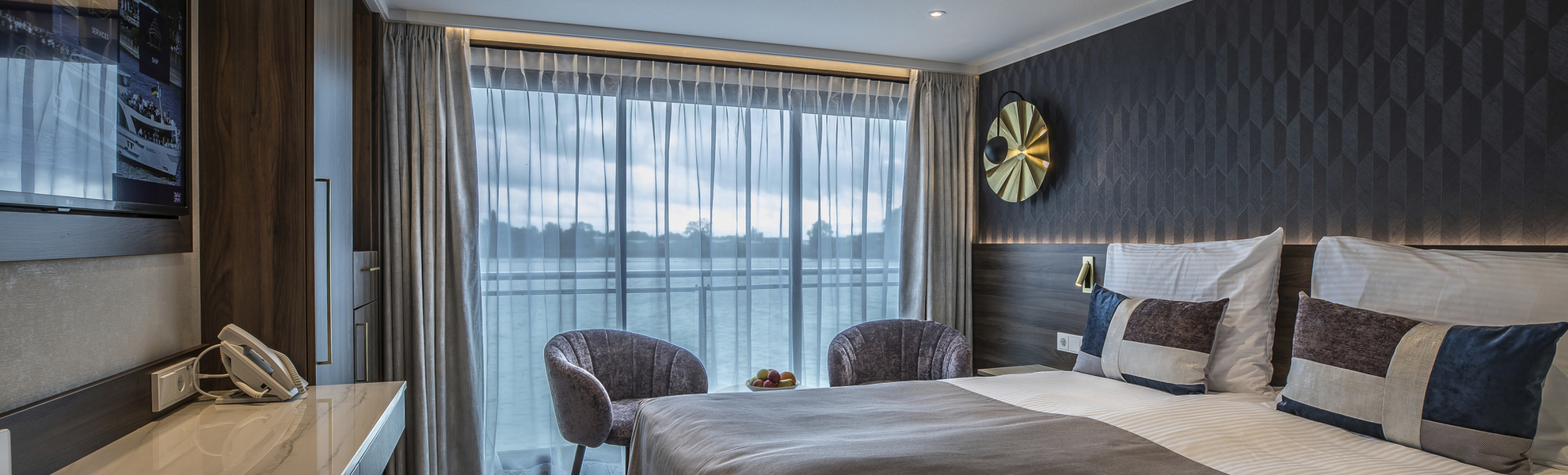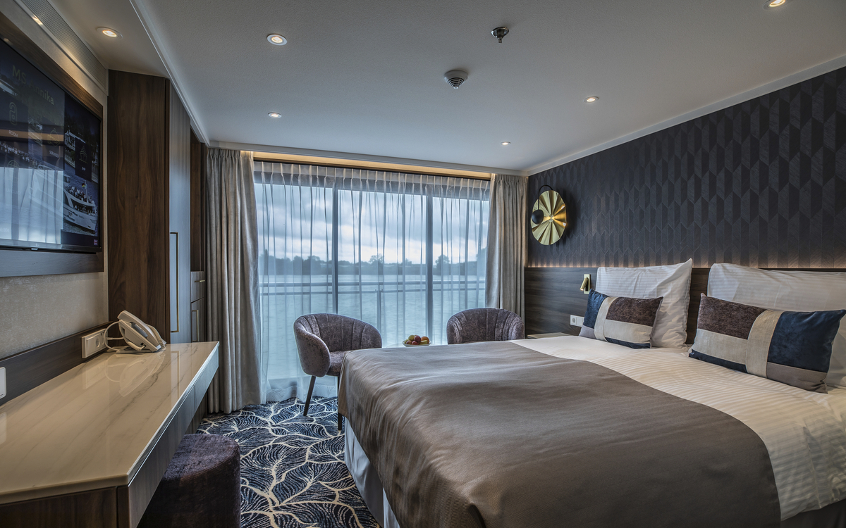 Es gibt 2 große Schränke, Spiegelkommode mit mehreren Schubfächern, Stuhl, Dusche/WC, Bademantel, Fön, SAT-TV (Empfang abhängig vom Fahrgebiet), individuell regulierbare Klimaanlage, Telefon, Minibar, Safe, (WLAN nicht inkl., Empfang abhängig vom Fahrgebiet).