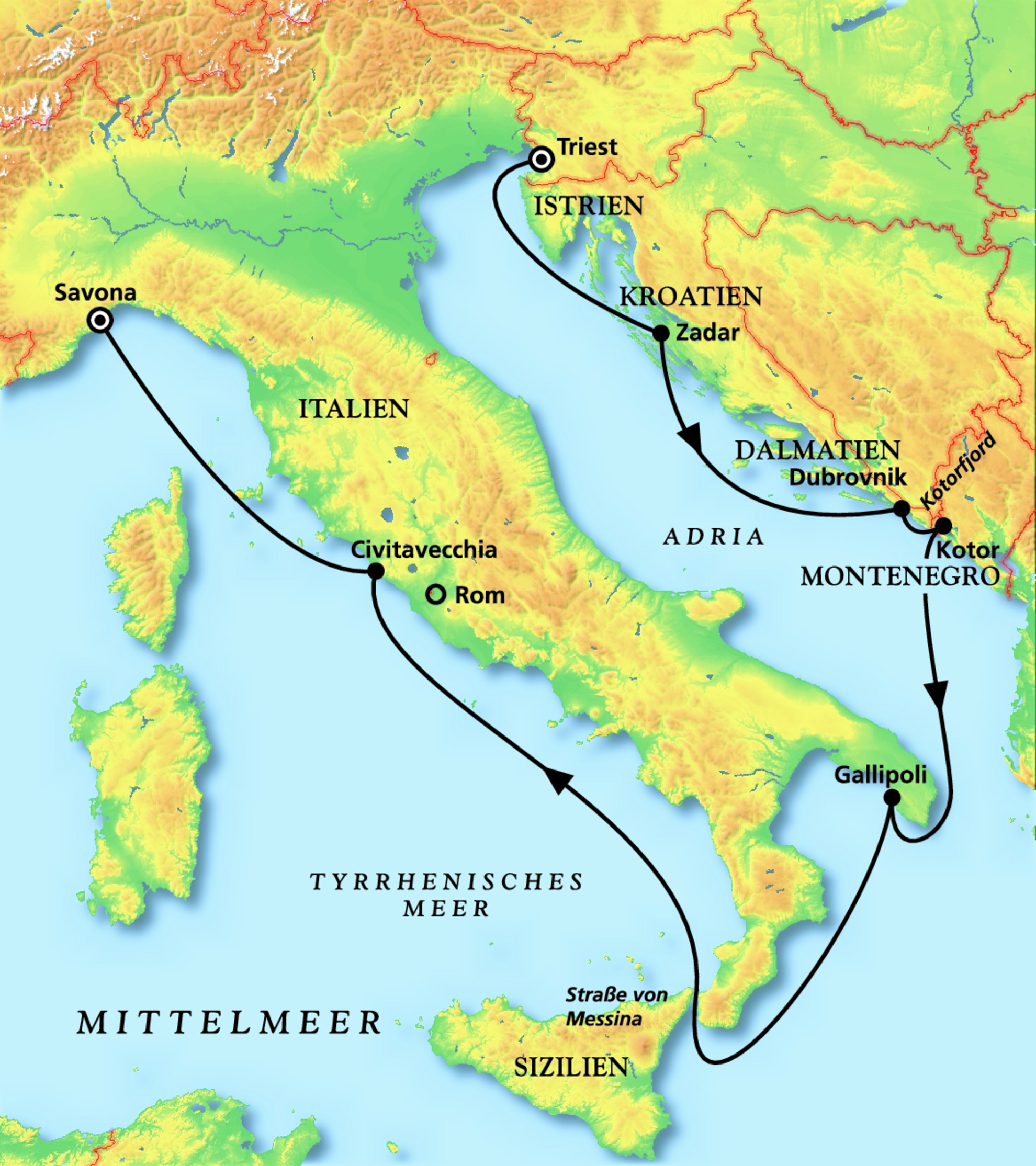 Triest - Zadar - Dubrovnik - Kotor - Gallipoli - Civitavecchia (Rom) - Savona