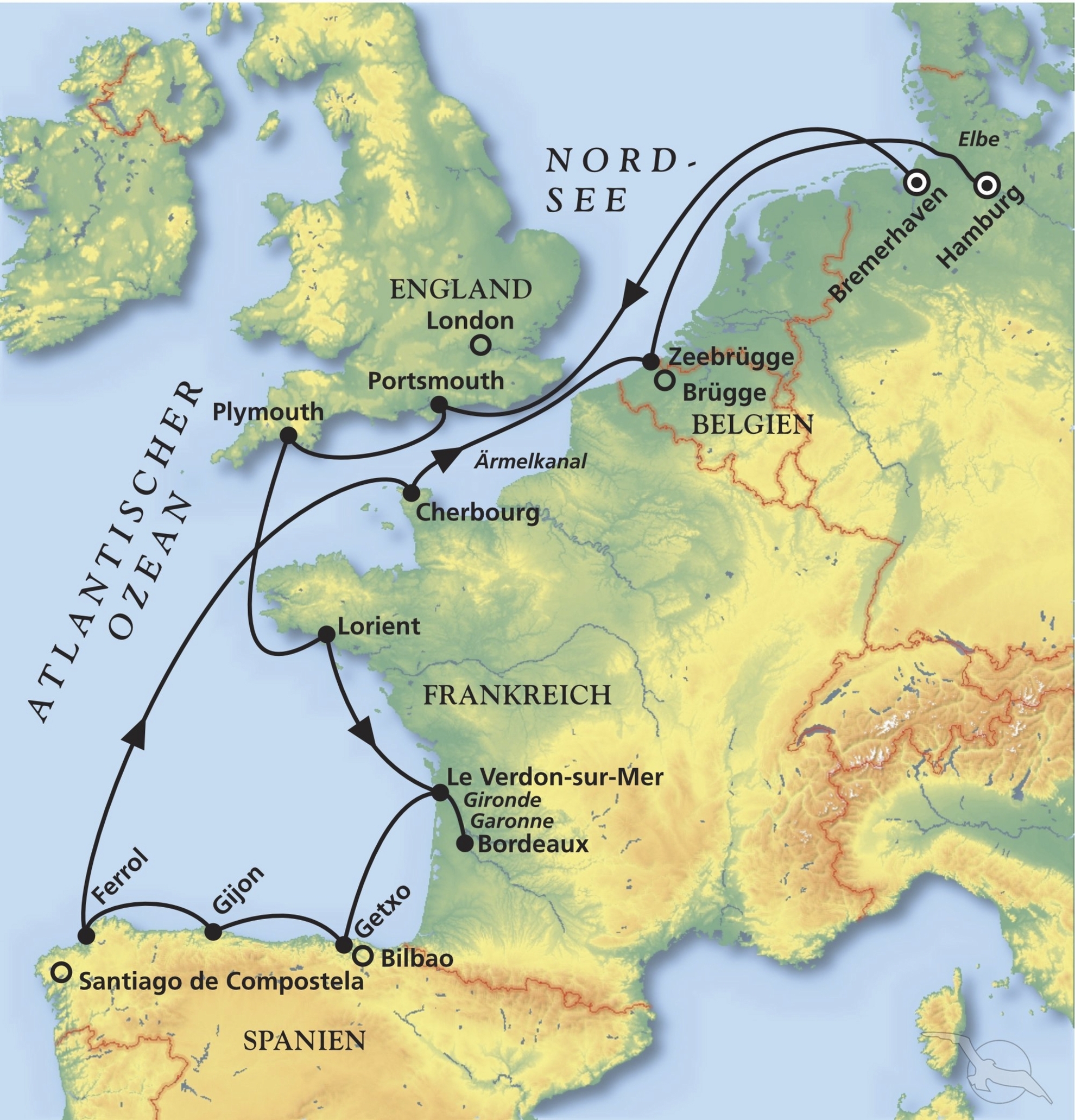 Bremerhaven - Portsmouth - Lorient - Bordeaux - Bilbao - Ferrol - Cherbourg - Zeebrügge - Hamburg