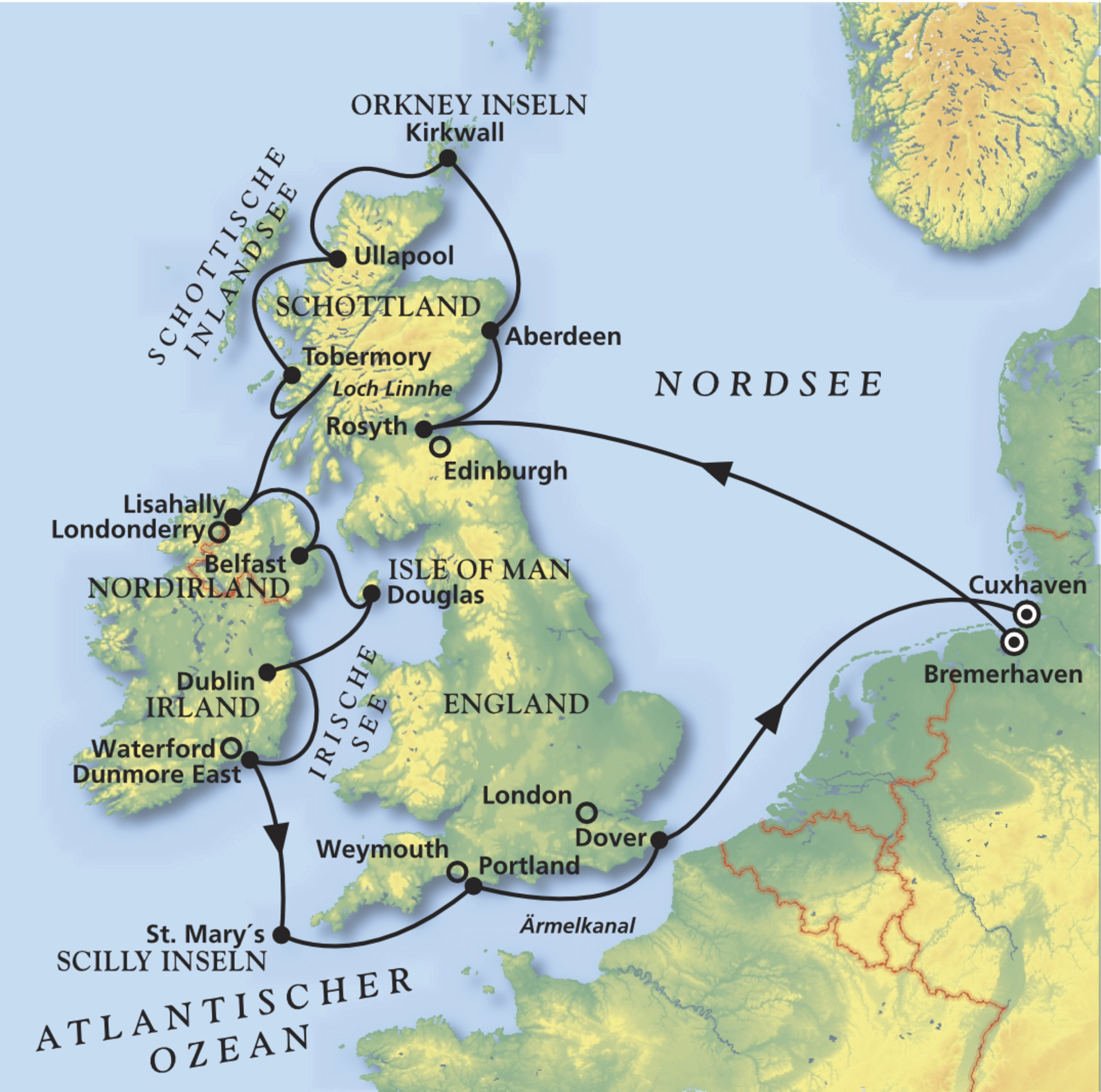 Bremerhaven - Rosyth (Edinburgh) - Aberdeen - Ullapool - Tobermory - Lisahally (Londonderry) - Belfast - Dunmore - St. Mary´s - Dover - Cuxhaven