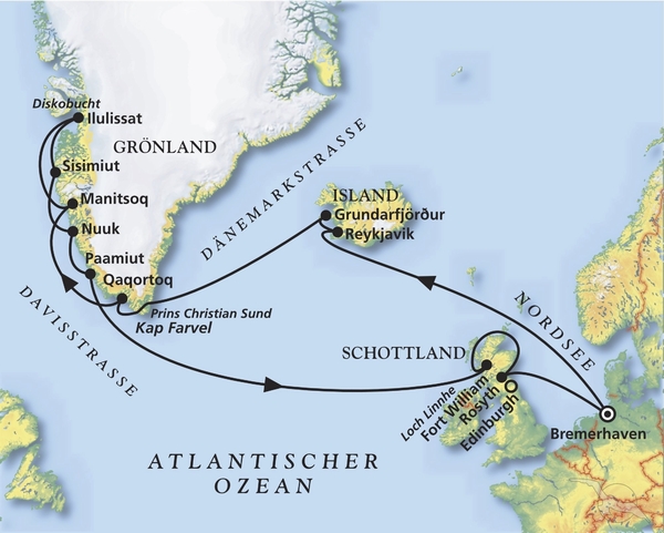 Bremerhaven - Reykjavik - Grundarffjördur - Prins Christian Sund - Ilulissat - Sisimiut - Nuuk - Fort Williams - Edinburgh - Bremerhaven