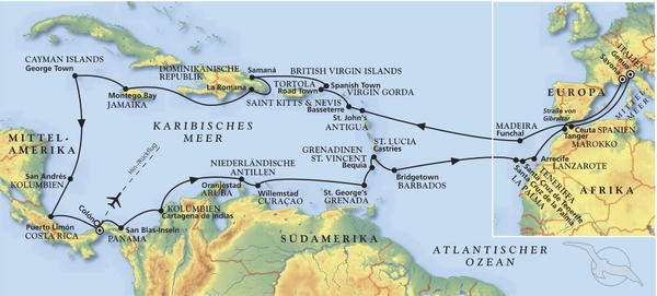 Die Seefahrtsgeschichte hat die kleine Handelsstadt Santa Cruz de La Palma geprägt. Spanier, Portugiesen, Briten, Deutsche, Venezolaner und Kubaner haben diese typisch spanische Kleinstadt beeinflusst. Historische Gebäude, Kirchen, Paläste, Einkaufsstraßen und kleine Bars bieten Motive für Maler und Fotografen. Mit dem Bus fahren Sie in das Inland über die naheliegenden Dörfer zum Aussichtspunkt Risco Alto. Vor der Spitze aus sieht man die Gärten von Kleinbauern sowie die bewaldete Bergkette La Palmas. Weiter fahren Sie zum Aussichtspunkt "La Concepcion", von wo aus sich einen einzigartiger Blick über die Stadt bietet. Auf dem Rückweg zum Schiff unternehmen Sie noch einen kurzen Stopp an der Kirche "Nuestra Señora de Las Nieves", Schutzpatronin der Insel. Von hier fahren Sie zurück zur Pier.