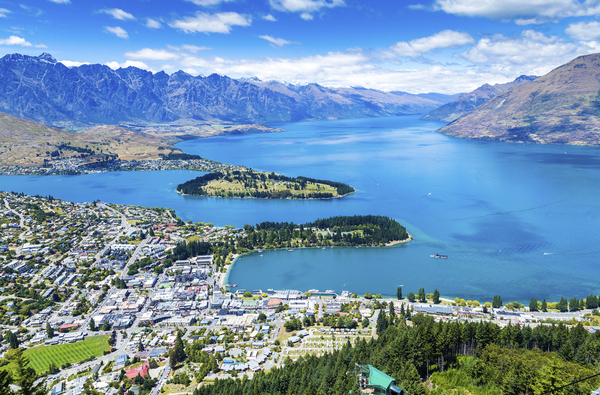 Queenstown mit Blick auf den See Wakatipu und die umliegenden Berge