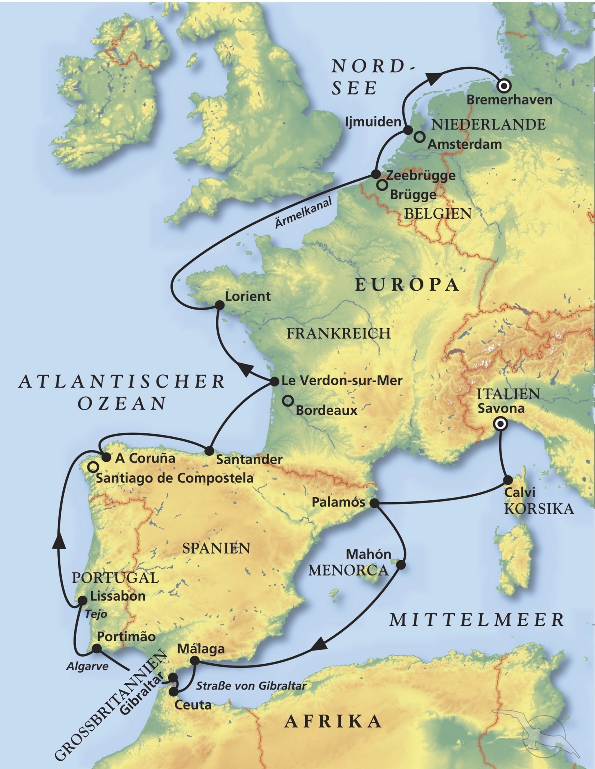 Savona - Calvi (Korsika) - Málaga - Ceuta - Portimão - Lissabon - Santander - Lorient - Zeebrügge (Brügge) - Ijmuiden (Amsterdam) - Bremerhaven