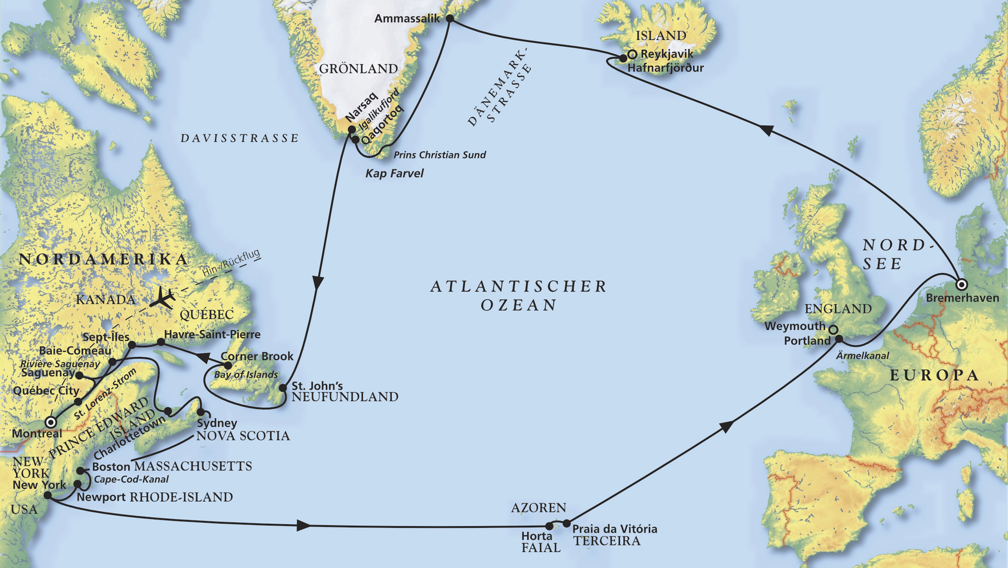 Bremerhaven - Reykjavik - Prins Christian Sund - Qaqortoq - St. John's - Québec City - Montreal - Charlottetown - Boston - New York - Horta - Portland - Bremerhaven