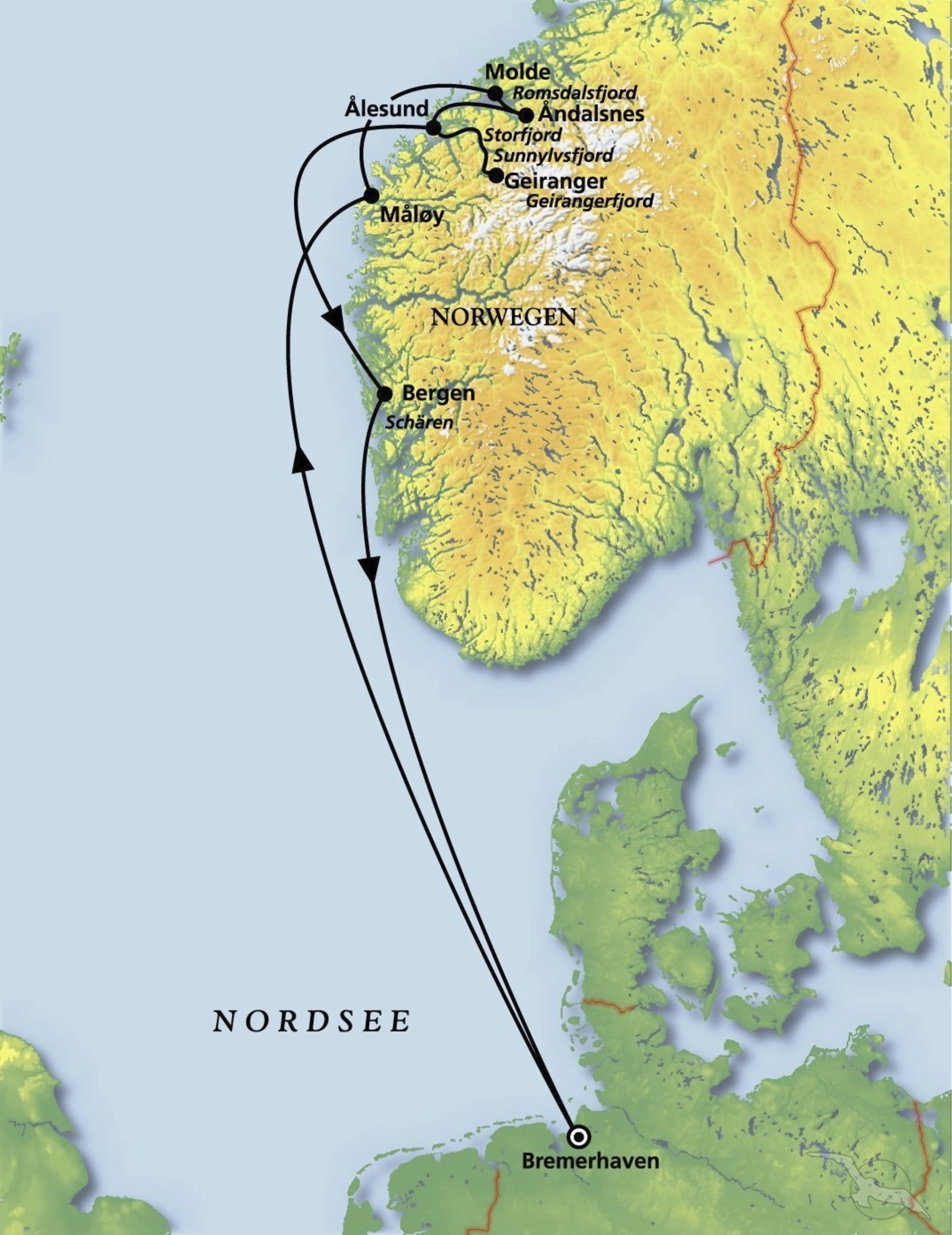 Bremerhaven - Måløy - Molde- Andalsnes - Ålesund - Geiranger - Bergen - Bremerhaven