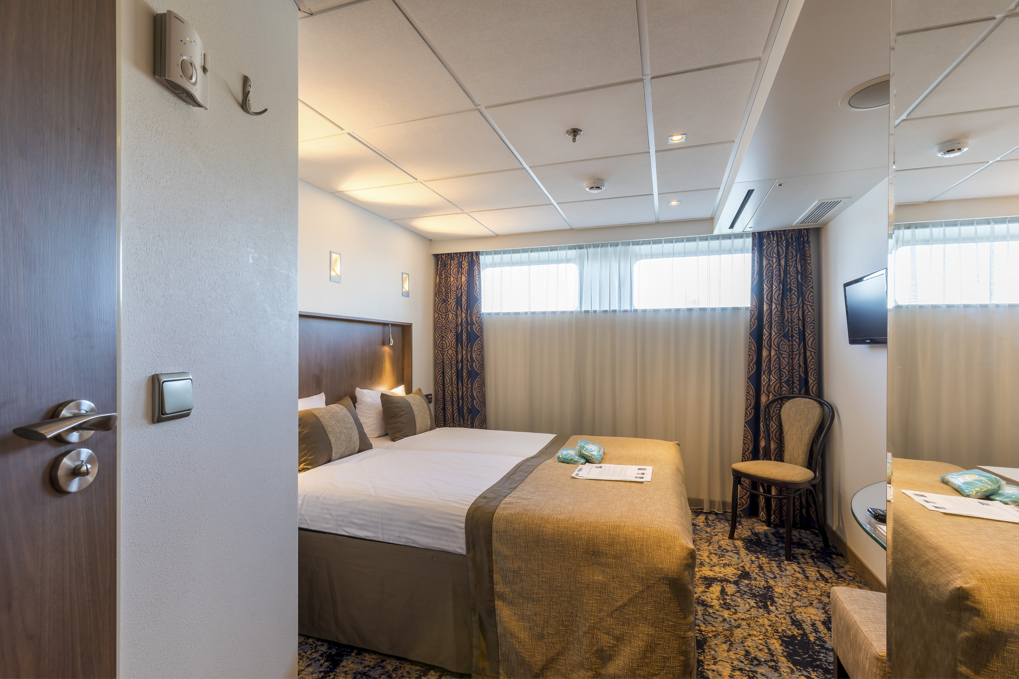 Alle Kabinen liegen außen, sind komfortabel und elegant eingerichtet mit kleinen Fenstern, die aus Sicherheitsgründen nicht zu öffnen sind. Die Betten lassen sich wahlweise als Doppel- oder Einzelbetten stellen.