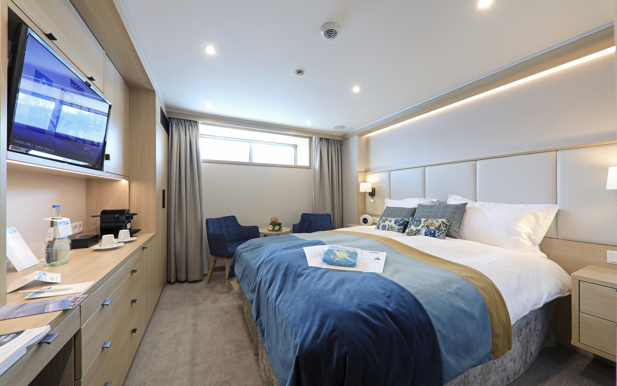 Es gibt 2 große Schränke, Spiegelkommode mit mehreren Schubfächern, Stuhl, Dusche/WC, Bademantel, Fön, SAT-TV (Empfang abhängig vom Fahrgebiet), individuell regulierbare Klimaanlage, Telefon, Minibar, Safe, (WLAN nicht inkl., Empfang abhängig vom Fahrgebiet).