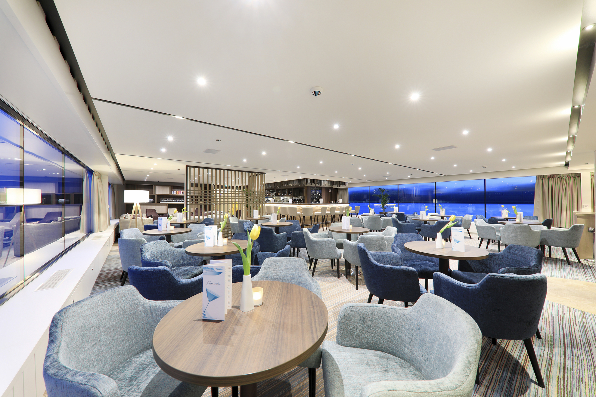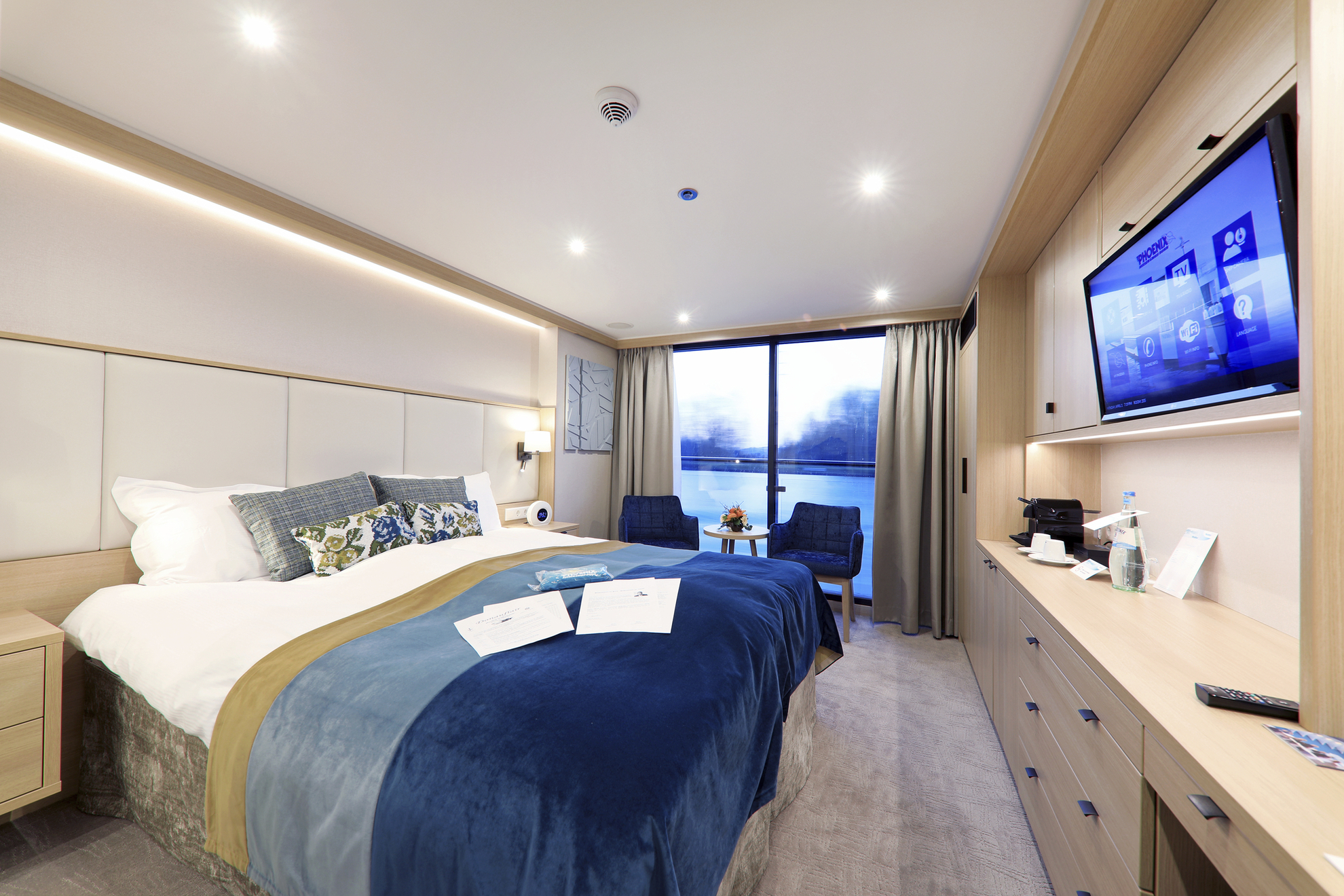 Es gibt 2 große Schränke, Spiegelkommode mit mehreren Schubfächern, Stuhl, Dusche/WC, Bademantel, Fön, SAT-TV (Empfang abhängig vom Fahrgebiet), individuell regulierbare Klimaanlage, Telefon, Minibar, Safe, (WLAN nicht inkl., Empfang abhängig vom Fahrgebiet).