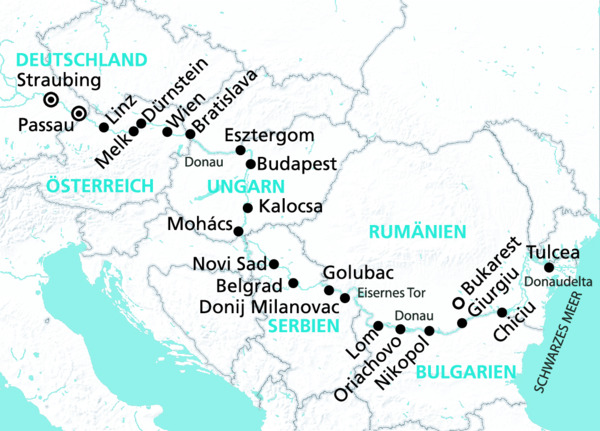Mit unserem komfortablen Schiff MS Alena erleben Sie die Donau ganz intensiv. Stromabwärts kreuzen Sie durch die Schlögener Schlinge zur Hauptstadt der Slowakei, Bratislava. Bereits am nächsten Tag erreichen Sie die Donaumetropole Budapest mit vielen interessanten Ausflugsmöglichkeiten. Entlang der Ufer Serbiens besuchen Sie Belgrad. Am nächsten Morgen passieren Sie frühmorgens das “Eiserne Tor“ und durchkreuzen die rumänische Tiefebene, bevor Sie in Giurgiu und Chiciu anlegen. Lernen Sie auf einer Stadtrundfahrt Bukarest kennen. Der nächste Tag steht im Zeichen der Erholung. Dann geht es wieder stromaufwärts, ein weiteres Mal am “Eisernen Tor“ vorbei, nach Ungarn. Wien ist immer wieder eine Reise wert. Nach einer Fahrt durch die wunderschöne Wachau geht Ihre bezaubernde Reise in Straubing zu Ende.