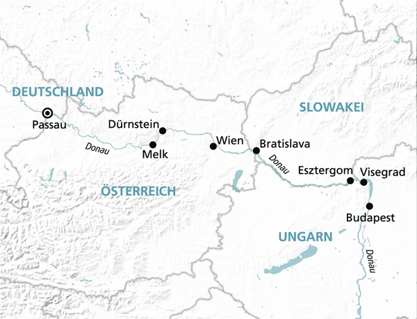 Diese siebentägige Reise bietet beste Gelegenheit, Bekanntschaft mit der einzigartigen Donau-Region und deren bewegter Geschichte zu machen. In Passau erwartet Sie Ihr Kreuzfahrtschiff. Bereits am nächsten Morgen liegt Ihnen Dürnstein in der Wachau zu Füßen. Nach Ihrem Besuch des urigen Ortes führt die Reise nach Ungarn, wo Sie am Morgen eine der ältesten Städte Ungarns kennenlernen, Esztergom. Am Nachmittag erreichen Sie Budapest. Das geschäftige Pester Zentrum die die vielen Sehenswürdigkeiten rund um den Budaberg sorgen für Kurzweil. Dem Donauknie folgend können Sie an Bord verbleiben oder  an einem Überlandausflug teilnehmen. Bratislava begeistert mit einer herausgeputzten Altstadt, dem Martins-Dom und dem Burgschloss. Die Walzerstadt Wien kann am Abend erkundet werden und ist auch Gastgeber für den gesamten nächsten Tag. Nach einer schönen Fahrt durch die Wachau legt Ihr Schiff in Melk an, wo Sie Gelegenheit haben, das Benediktinerstift zu besuchen.