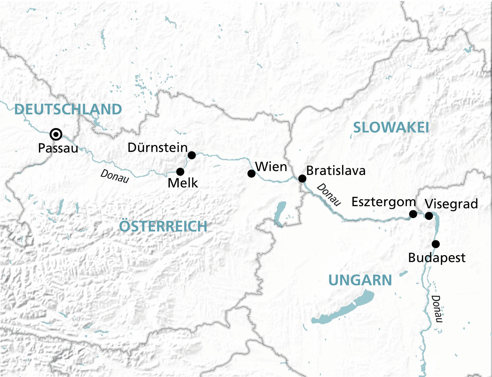 Diese siebentägige Reise bietet beste Gelegenheit, Bekanntschaft mit der einzigartigen Donauregion zu machen. In Passau erwartet Sie Ihr Kreuzfahrtschiff. Bereits am nächsten Morgen liegt Ihnen Dürnstein in der Wachau zu Füßen. Nach Ihrem Besuch des urigen Ortes führt die Reise nach Ungarn, wo Sie am Morgen eine der ältesten Städte Ungarns kennenlernen, Esztergom. Am Nachmittag erreichen Sie Budapest. Das geschäftige Pester Zentrum und die vielen Sehenswürdigkeiten rund um den Budaberg sorgen während Ihres Aufenthaltes für Kurzweil. Dem Donauknie folgend können Sie an Bord verbleiben oder an einem Überlandausflug teilnehmen. Bratislava begeistert mit einer herausgeputzten Altstadt, dem Martins-Dom und dem Burgschloss. Die Walzerstadt Wien kann am Abend erkundet werden und ist auch Gastgeber für den gesamten nächsten Tag. Nach einer schönen Fahrt durch die Wachau legt Ihr Schiff in Melk an, wo Sie Gelegenheit haben, das Benediktinerstift zu besuchen.