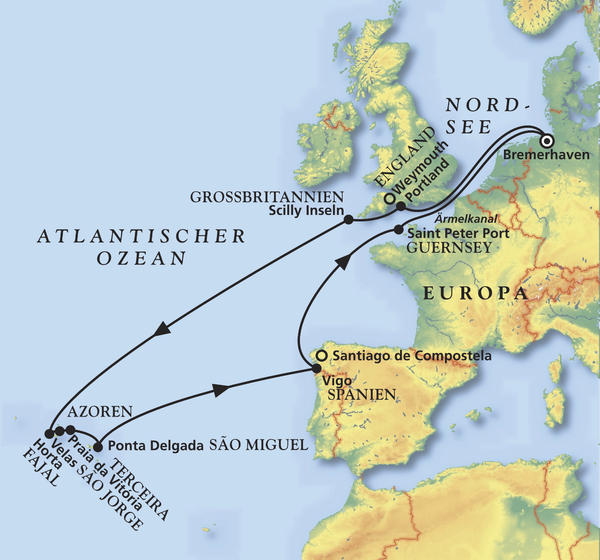 Bremerhaven - Portland - Scilly Inseln - Horta - Praia da Vitória - Ponta Delgada - Vigo - Saint Peter Port - Bremerhaven