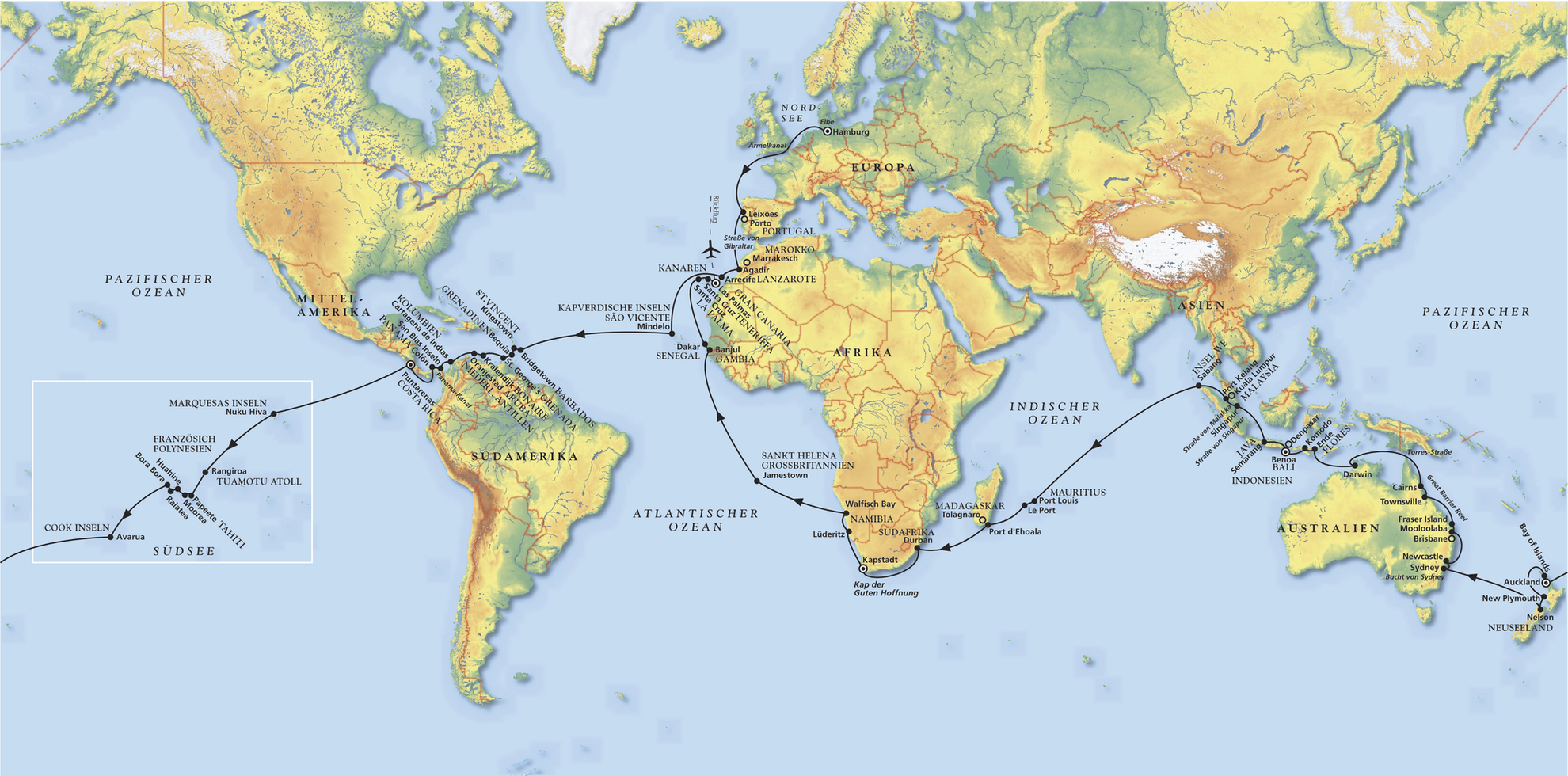 Hamburg - Arrecife - Bridgetown - Panama-Kanal - Bora Bora - Auckland - Sydney - Bali - Sabang - Port Louis - Durban - Kapstadt - Lüderitz - Jamestown - Banjul - Santa Cruz - Las Palmas