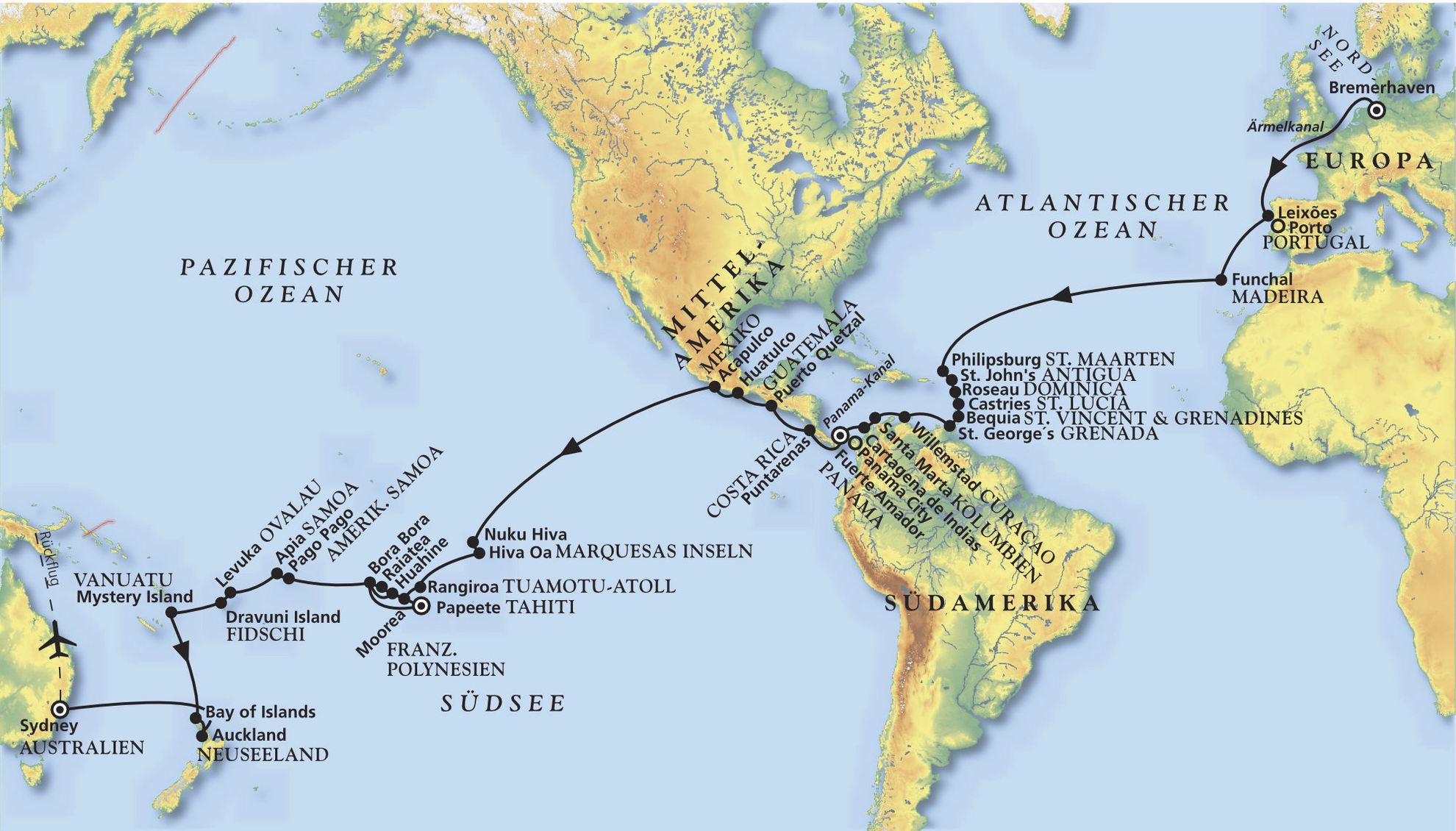 Bremerhaven - Funchal - Antigua - Durchfahrt Panama-Kanal - Acapulco - Bora Bora - Moorea - Sydney