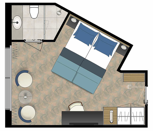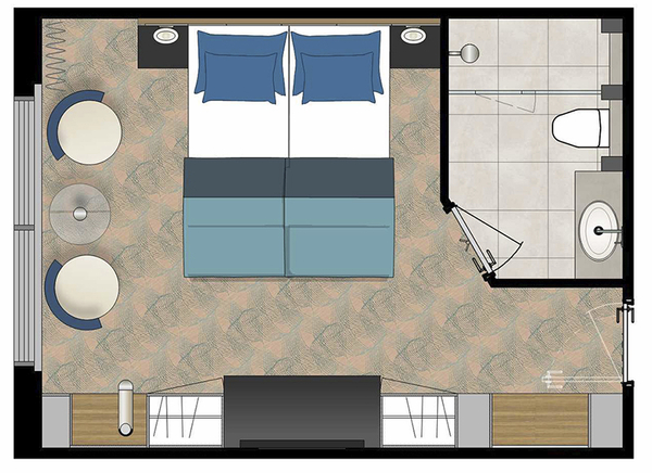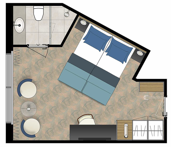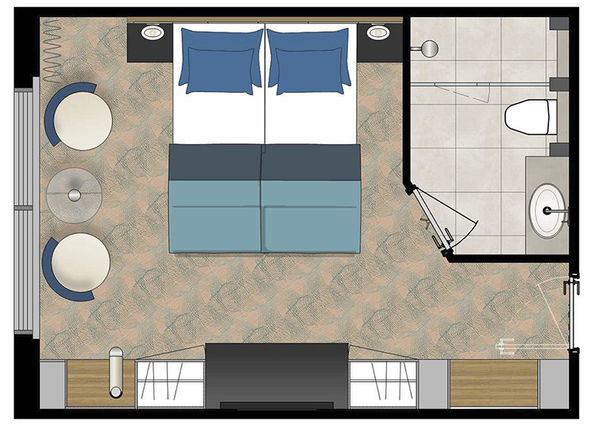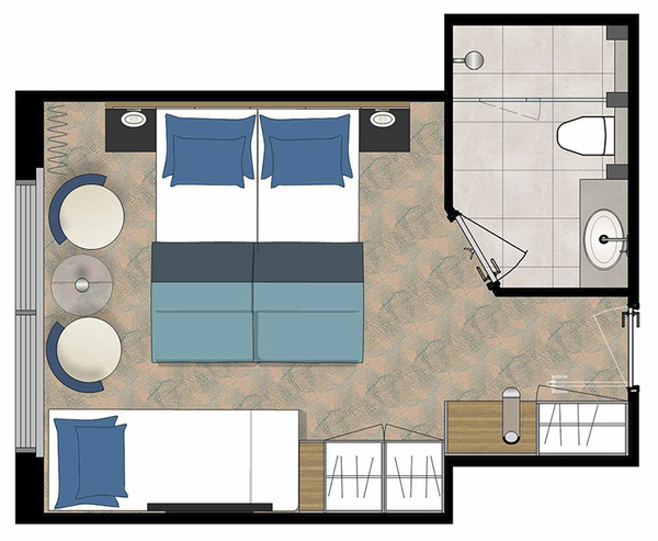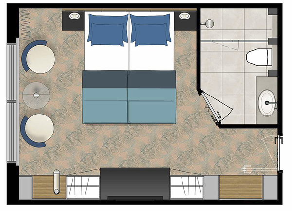 Ausstattung: Dusche/WC, Fön, individuell regulierbare Klimaanlage, SAT-TV (Flachbirldschirm), Radio, Minibar, Kaffeemaschine, Safe, telefon, Bodspannung 230 V Wechselstrom. Kabinengröße ca. 17 qm.