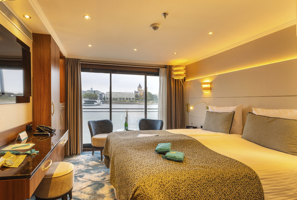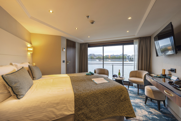 Alle Kabinen liegen außen und sind komfortabel und luxuriös eingerichtet und haben einen französischen Balkon. Die Betten lassen sich wahlweise als Doppel- oder Einzelbetten stellen