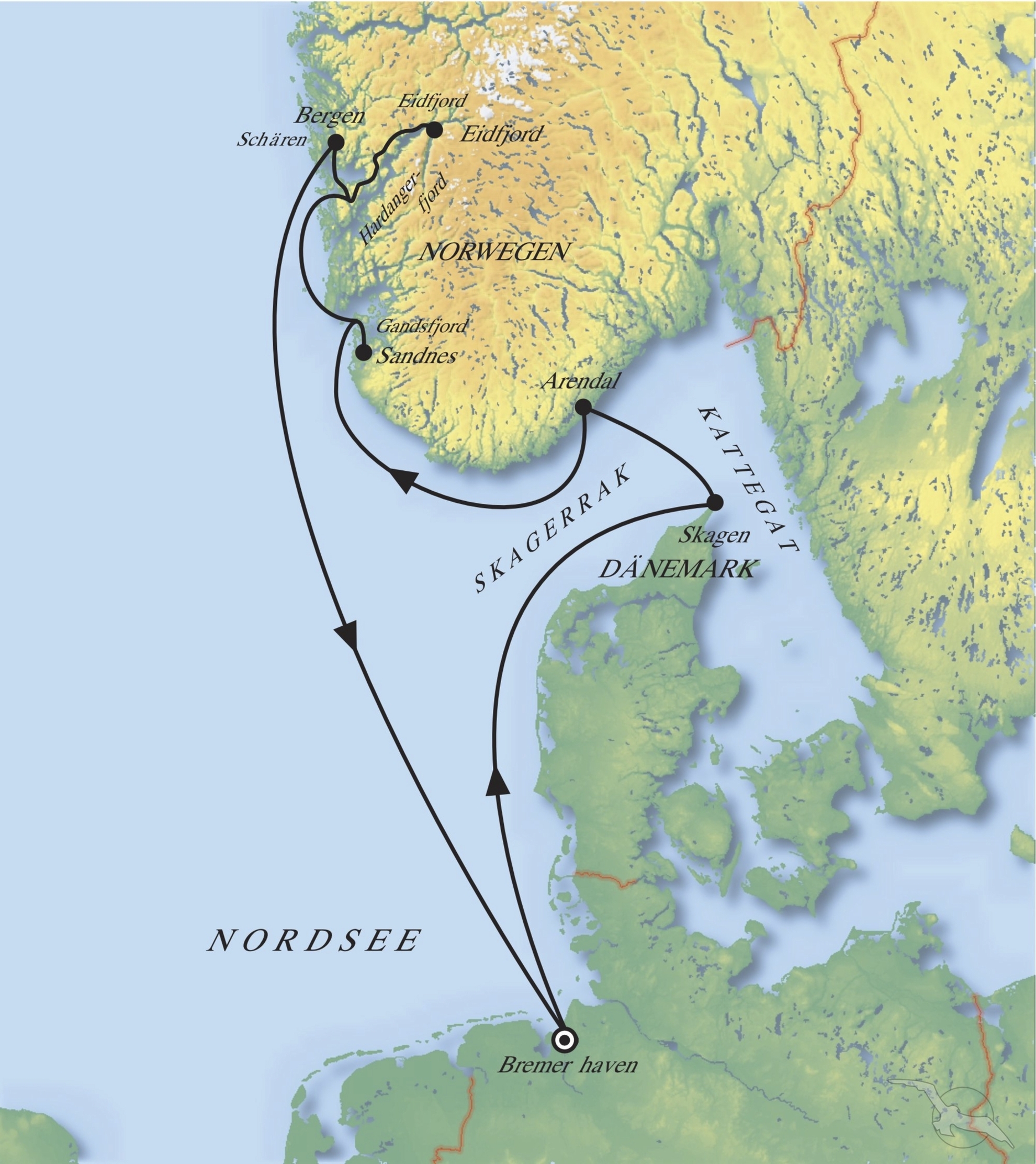 Bremerhaven - Skagen - Arendal - Sandnes - Eidfjord - Bergen - Bremerhaven