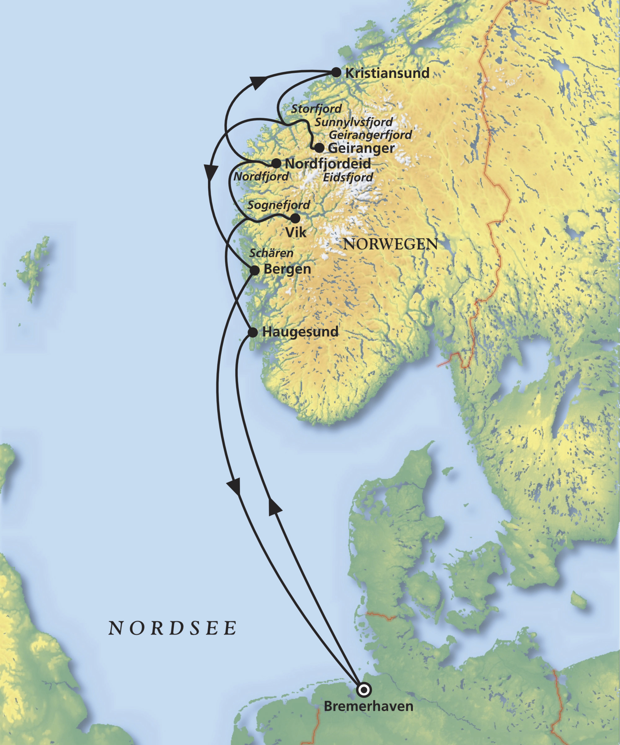 Bremerhaven - Haugesund - Vik - Nordfjordeid - Kristiansund - Geiranger - Bergen - Bremerhaven