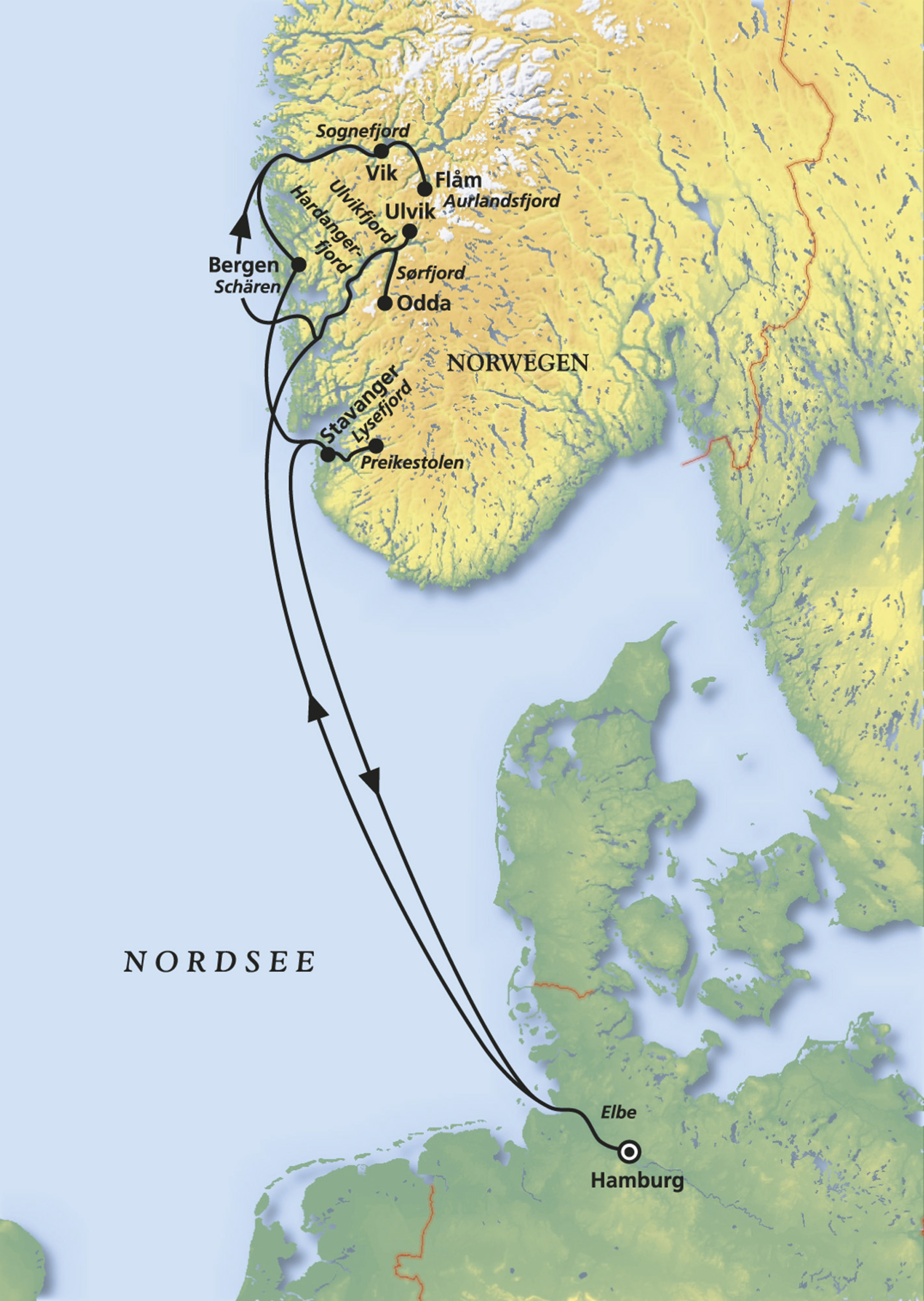 Hamburg - Odda - Ulvik - Vik - Flåm - Bergen - Stavanger - Hamburg