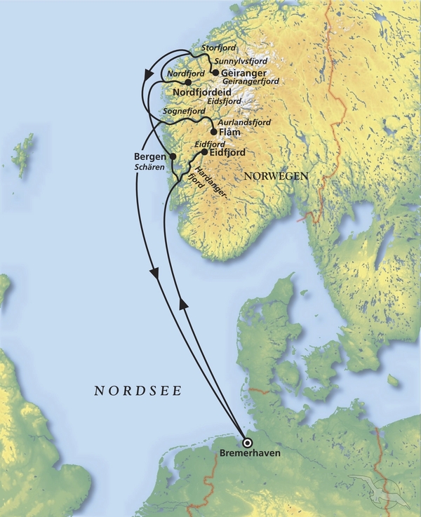 Bremerhaven - Eidfjord - Bergen - Nordfjordeid - Geiranger - Flåm - Bremerhaven