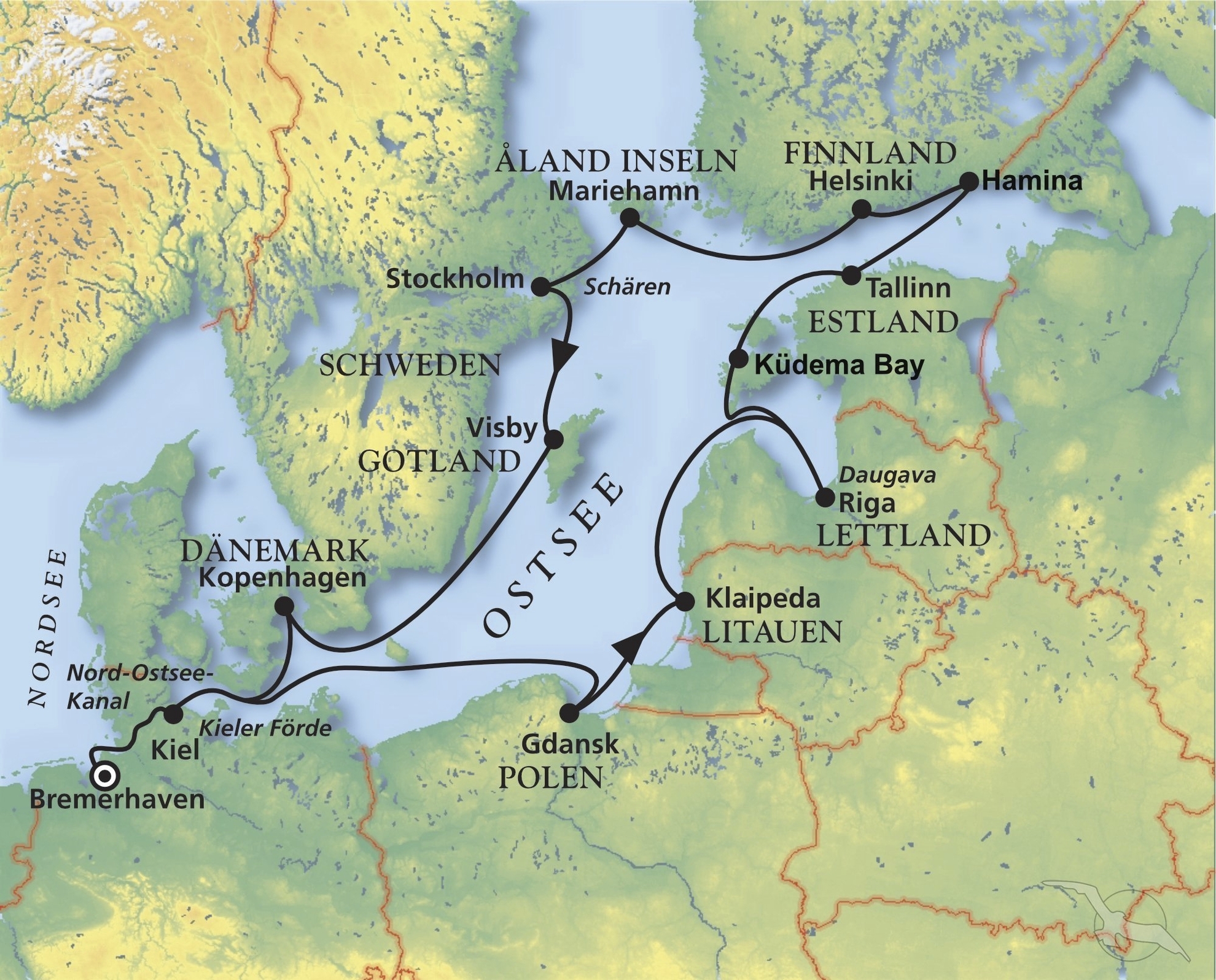 Bremerhaven - Danzig - Klaipeda - Riga - Insel Saarema - Tallinn - Hamina - Helsinki - Stockholm - Visby - Kopenhagen - Kiel - Bremerhaven