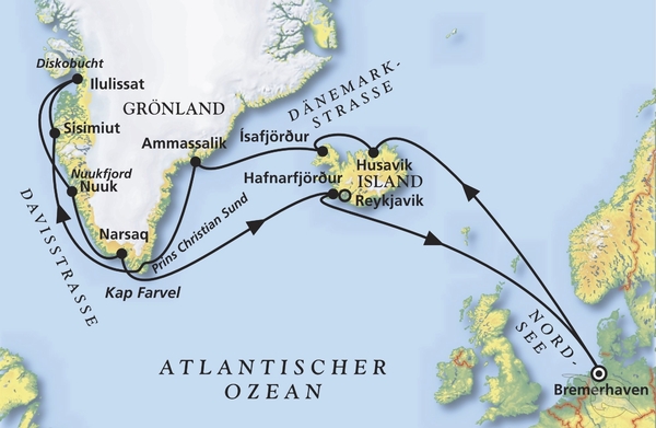 Bremerhaven - Husavik - Isafjördur - Ammassalik - Sisimiut - Ilulissat - Nuuk - Narsaq - Bremerhaven