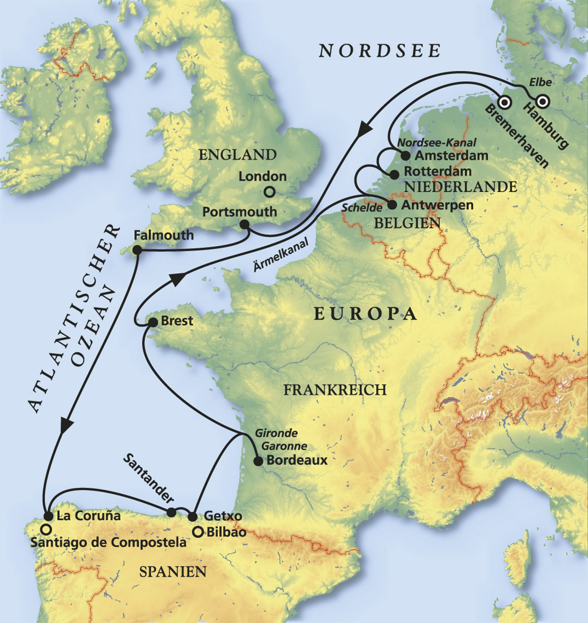 Hamburg - Portsmouth - Falmouth - A Coruña - Getxo - Bordeaux - Brest - Antwerpen - Amsterdam - Bremerhaven