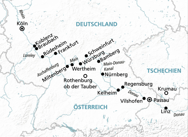 Köln - Koblenz - Rüdesheim - Frankfurt - Miltenberg - Würzburg - Bamberg - Nürnberg - Kehlheim - Regensburg - Passau