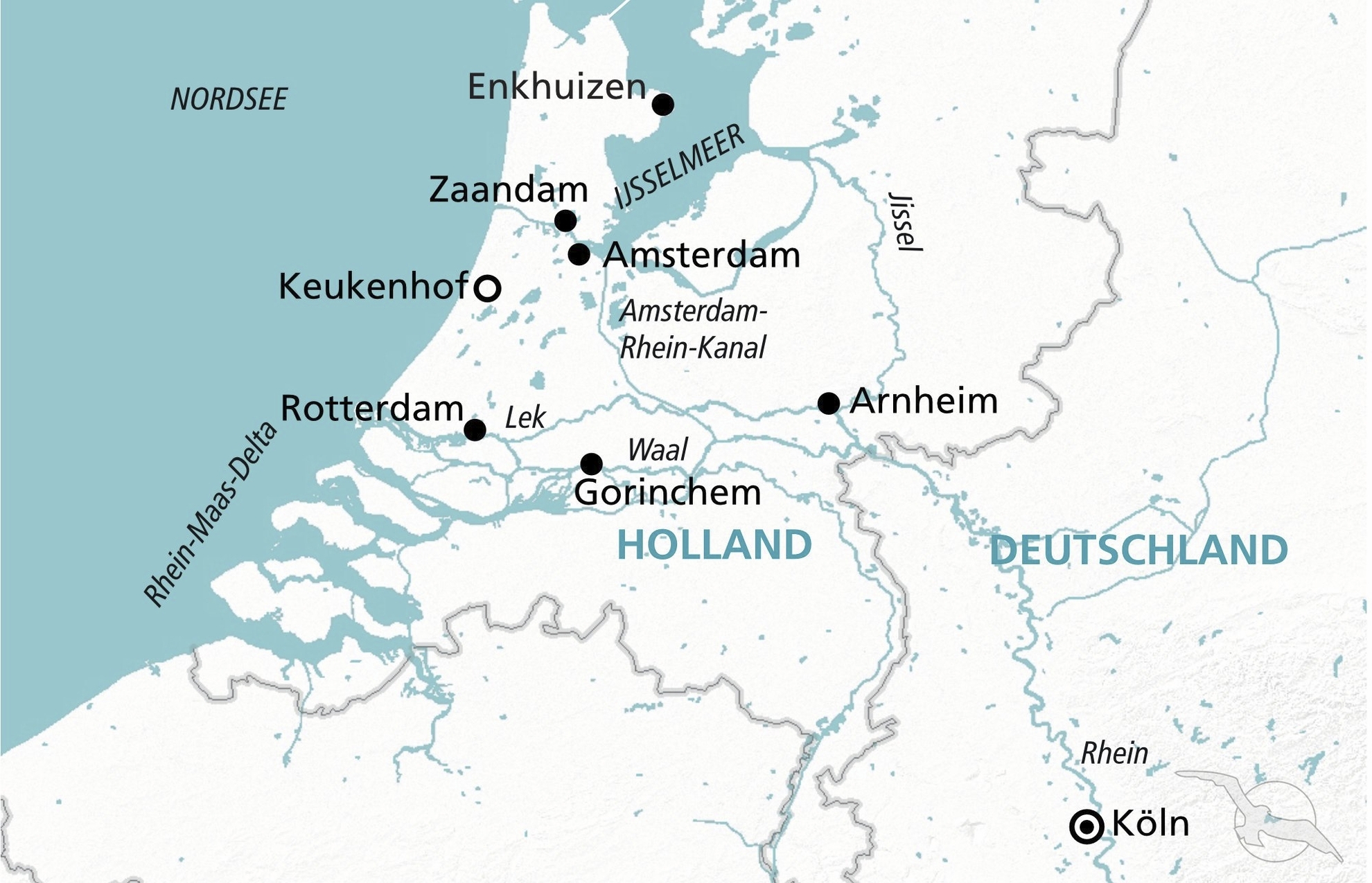 Kommen Sie an Bord unseres Premium-Schiffes MS Annika und genießen Sie während eines Kurzurlaubes die Vielfalt Hollands. Sie bummeln über die Blumenmärkte sowie entlang der Grachten von Amsterdam und genießen den Blick auf die hochherrschaftlichen Patrizierhäuser während einer Grachtenrundfahrt. Über das Ijsselmeer bringt Sie Ihr Schiff zu der verträumten "Heringsstadt" Enkhuizen. Hier tragen die MEnschen noch die traditionsreichen Trachten. Als nächstes haben Sie Gelegenheit, die Hafenstadt Rotterdam zu besuchen. Erleben Sie die schöne Stadt Gorinchem in Südholland während eines Stadtrundganges. Stromaufwärts geht es nach einem Besuch in Arnheim wieder zurück nach Köln.