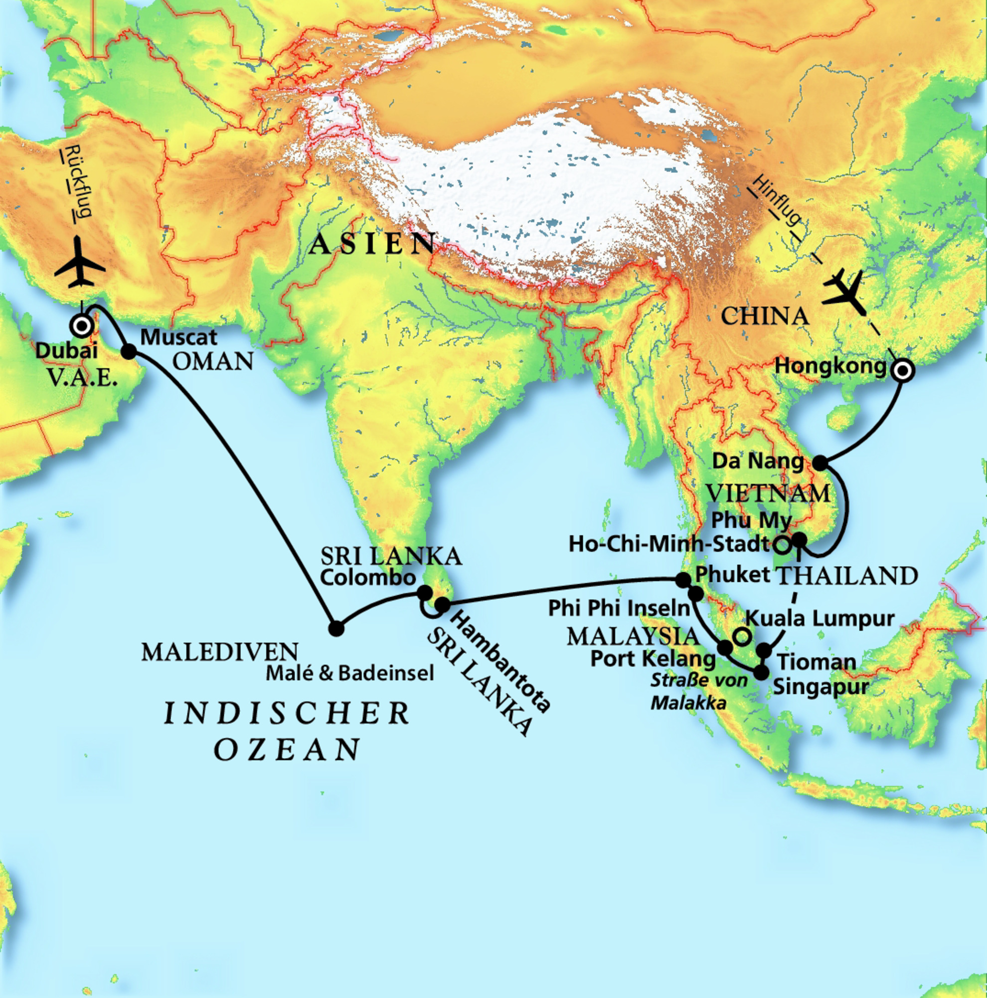 Hongkong - Da Nang - Phu My (Ho Chi Minh-Stadt) - Singapur - Colombo - Malé - Muscat -Dubai