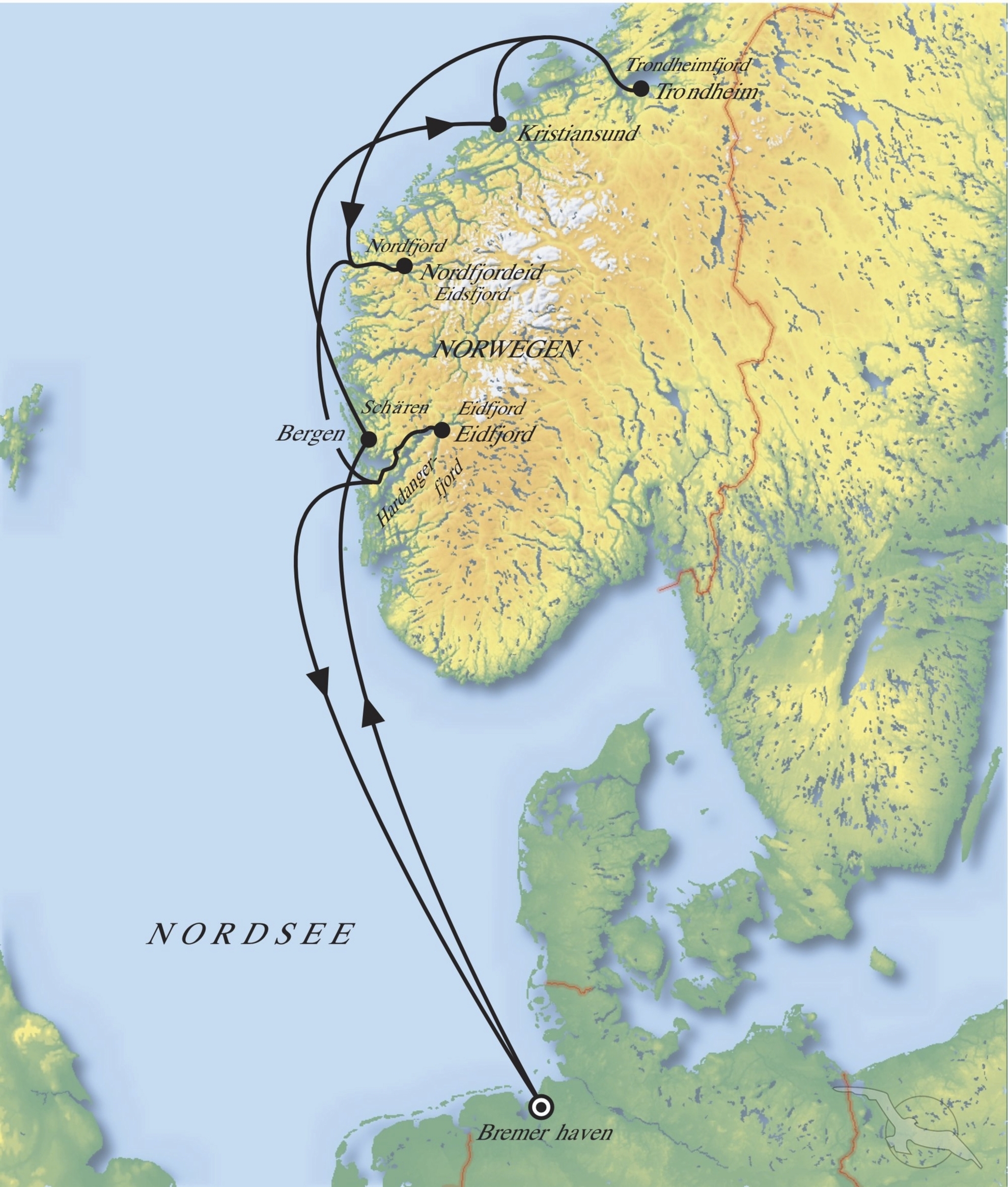Bremerhaven - Bergen - Kristiansund - Trondheim - Nordfjordeid - Eidfjord - Bremerhaven